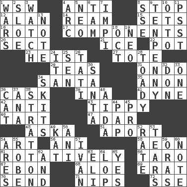 ACROSS 1. Compass dir. 4. Against 8. Close up, plug up 12. ____ Jay Lerner 14. 480, 500 or 516 sheets of paper 15. Puts into a specified state 16. Printing process, for short 17. Parts 20. Religious group 21. Frozen water 22. Plant holder 23. Robbery 27. Carry 29. Afternoon social gatherings 31. Southwest Nigerian state 34. Before Barbara or Clara 35. Soon (poet.) 36. Keg 39. _ tizzy (2 wds.) 41. Unit of force 42. Against 43. Likely to tip or tilt 46. Small pie 47. The sixth month of the Jewish calendar 48. "____ silly question..." 51. To the left, to Queeg 54. Nonscientific branch of learning 56. Cuckoo 58. Age 61. Rotating or pertaining to rotation 66. Pacific island yam 67. Inky black, to poets 68. Medicinal plant 69. Part of Q.E.F. 70. Post 71. Cuts off 72. Compass dir. DOWN 1. Armed conflicts 2. _ gin 3. Observe 4. Curve 5. Modern: prefix 6. Scottish cap 7. Body of Kaffir warriors 8. Compass dir. 9. 3-inch nail 10. "Beetle Bailey" pooch 11. Inconspicuous attention getter 13. Make mention of 18. Sep. follower 19. Modern: prefix 24. Call ___ day 25. Elected rep. 26. Jacques of French films 28. Sycophant 30. Before Barbara or Clara 32. Spanish title 33. Single 34. Burlesque acts 36. Domesticated feline 37. Santa ___, CA 38. Ski resort town in Vermont 40. Opera by Verdi 44. Infant food 45. Adept person 49. Krazy ___ of comics 50. Cuckoo 52. Pace 53. Separates forcefully 54. Ancient Greek god of war 55. Loose flowing garment 57. "Terrible" tsar 59. Mouths or openings 60. Observe 62. Also 63. Connecticut Ivy Leaguer 64. Chop off 65. Consenting reply