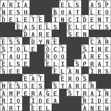 ACROSS 1. Roberta Peters solo 5. Raised railways 8. Cleo's killer 11. Delicate 12. Water vessel 13. Lion 14. Erase 17. Happening 19. Artist's stands 21. Chooses 22. Have the gumption 23. Elected rep. 24. Double-curved letter 27. Unit of force 29. 4-wheeled motor vehicle 32. Took without asking 34. Sep. follower 36. Trig term 37. "Change" in Tahitian 38. Friend of Pooh 39. Ancient Greek god of war 40. Otherwise 41. Connecticut Ivy Leaguer 42. Small fatty European fish 43. Perceive with the eye 44. Style 46. Big collection agency 47. Ingest 50. Greek god of love 52. Makes clutter 55. A viewer who gazes fixedly 57. Electrical Measurement 59. Put through a sieve 62. _ de Janeiro 63. The content of cognition 64. Travel on an animal 65. Tate display 66. Snakelike fish 67. Afresh DOWN 1. Added to 2. To separate or throw off 3. Capri or Wright 4. At or in the front 5. Age 6. Shoestrings 7. Vertical member of a panel or frame 8. Actor Baldwin 9. Emitted 10. Plant holders 12. Twice 15. Sadhe (variant) 16. Suggestive of the supernatural 18. Lair 20. Poe poem 24. _____ Park, CO 25. Lacking originality or spontaneity 26. Lush 28. Learning spot: Fr. 29. High-altitude cloud 30. Approach 31. Musical pauses 33. Falsehood 35. Bathroom 36. Plant excrement 42. Derisive sound 45. Ancient river in northeast Turkey 47. Compass dir. 48. Nest on high 49. Sadhe (variant) 51. Spanish missionary in California 52. Hindu Mythology: god of death 53. Independent ruler or chieftain 54. Blemish 55. Ocean 56. Precipitation 58. Set 60. Binary compound 61. ___ Haven, CT