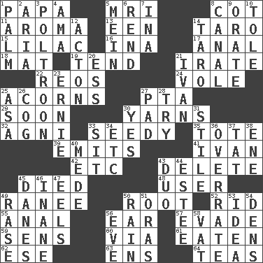 ACROSS 1. Dad 5. Medical imaging device (abbr.) 8. Small bed 11. Scent 13. Car or cant ending 14. Pacific island yam 15. Pale purple color 16. _ tizzy (2 wds.) 17. Of or related to the anus 18. Floor protector 19. Watch over 21. Feeling or showing extreme anger 22. Vintage cars 24. Grand slam 25. Oak nuts 27. Parent Teacher Association (abbr.) 29. Within a short period 30. Entertaining tales 32. Hindu god of fire 33. Shabby and untidy 35. Carryall 39. Sends forth 41. _ the terrible 42. And so on (abbr.) 43. Keyboard key 45. Passed on 48. One who uses or employs something 49. Indian princess (variant) 50. Carrot, for example 52. To free from 55. Of or related to the anus 56. Ewer handle 57. Elude 59. Elected reps. 60. By way of 61. Eroded 62. Compass dir. 63. Followers of ems 64. Beverages made from leaves DOWN 1. Inside of hand 2. Roberta Peters solo 3. Coward 4. Housemaid (var.) 5. Chow _ 6. Tear apart 7. _ tizzy (2 wds.) 8. Lessep's creation 9. Declaim 10. Lacquered or enameled metalware 12. Gambison 14. Edible starchy tuberous root 20. Curvy letter 21. "Terrible" tsar 23. Bert's buddy 25. White ___ sheet 26. Gear tooth 27. Writing tablet 28. Attempt 30. It is so 31. Vertical member of a panel or frame 33. Be seated 34. And so on (abbr.) 36. Make much ado about nothing 37. Make lace 38. Compass dir. 40. Ancient Persian 43. Superhero pair 44. First name in cosmetics 45. Natives or inhabitants of Denmark 46. Lacking in sense or substance 47. Snakelike fish 49. To erase 50. Precipitation 51. Mouths or openings 53. The main thing one is thinking about 54. Cub Scout units 56. Night before a holiday 58. Large container