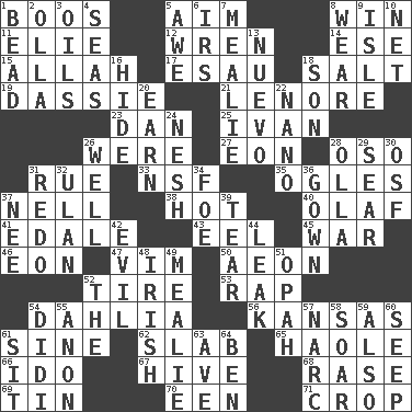 ACROSS 1. Expressions of contempt or scorn 5. Direct toward a target or goal 8. Acquire through effort 11. Writer Wiesel 12. Songbird 14. Compass dir. 15. Assad's deity 17. He sold his birthright 18. Table seasoning 19. Hyrax 21. Poe poem 23. One of the 12 tribes of Israel 25. "Terrible" tsar 26. Past tense of be (plural) 27. Age 28. Bear (Spanish) 31. Sorrow 33. Science/research agcy. 35. Stares 37. 1994 drama film starring Jodie Foster 38. Being at a high temperature 40. Norwegian king 41. Peak District village in England 43. Snakelike fish 45. Armed conflict 46. A really long time 47. Zeal 50. Period of immesurable duration 52. Become fatigued 53. Strike 54. A pale violet or amethyst color 56. Sunflower state 61. Trig term 62. Broad, flat, thick piece 65. White Person, in Hawaii 66. Wedding promise 67. Hub of activity 68. To erase 69. Shallow baking pan 70. Car or cant ending 71. Riding implement DOWN 1. Necklace unit 2. Spanish pot 3. Lubricates 4. Oceans 5. Deep reverence 6. Big collection agency 7. Ear of corn 8. Erode 9. Capri or Wright 10. Fish or hair follower 13. New (sp.) 16. Flintstone garb 18. Manchild 20. Merit 22. Billionth: prefix 24. Delicate 26. Not ill 28. Rounded earthenware pot or jar 29. Burn superficially 30. Order of Saint Francis (abbr.) 31. Do over again 32. ____ Bator 34. Enemy 36. Long dress 37. Born 39. Separate forcefully 42. Morally bad or wrong 44. Path through which fluid escapes 48. From or relating to Ireland 49. Ear of corn 51. Brightly colored fish 52. Definite Article 54. "You Light Up My Life" star Conn 55. At once, immediately (arch.) 57. Drug cop 58. Fly high 59. In addition 60. Ooze 61. Be seated 63. "___ Maria" 64. Benjamin's nick name