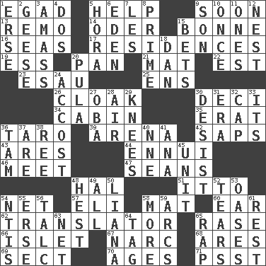 ACROSS 1. Mild oath 5. Assist 9. Within a short period 13. San ____ (Riviera town) 14. River in Europe 15. Maid-servant 16. Oceans 17. Homes 19. Curvy letter 20. Baking dish 21. Floor protector 22. Eastern Standard Time (abbr.) 23. Son of Isaac 25. Followers of ems 26. Cover or conceal 30. Tenth: prefix 34. Apartment or room in a ship 35. Part of Q.E.F. 36. Pacific island yam 39. Sports stadium 42. Plant excrements 43. Ancient Greek god of war 44. World-weariness 46. Rendezvous 47. Actors Connery and Penn 48. Actor Linden 51. "Tell ____ the Marines!" 54. Fish or hair follower 57. Biblical high priest 58. Floor covering 60. Hearing organ 62. Interpreter 65. Raze (variant) 66. Small island 67. Drug cop 68. Ancient Greek god of war 69. Religious group 70. Grows older 71. Inconspicuous attention getter DOWN 1. Celtic language 2. Honkers 3. Collect or gather 4. Two (Sp.) 5. Israeli folk dance 6. Paradise 7. French article 8. A-one 9. Male child 10. Single time 11. Washington bills 12. A home for chicks 15. Antes 18. Daniel's nick name 20. Monetary unit of Botswana 24. Buttonhole 27. Chief or king in Benin or Nigeria 28. Wind 29. Leg joints 30. Cease 31. Period 32. Head covering 33. It is 36. Scottish cap 37. "We ___ not amused" (Victoria) 38. To riddle 40. Compass dir. 41. Santa ___, CA 45. A single undivided whole 48. Command 49. Everything 50. Woody, climbing, usually tropical plant 52. Pulls into pieces 53. Fertile tracts in a desert 54. Nuclear Threat Initiatives 55. Celtic language 56. Baby powder 58. Greater amount 59. Curves 61. Remainder 63. Fish or hair follower 64. Label 65. Strike