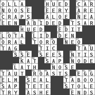 ACROSS 1. Rounded earthenware pot or jar 5. Took on color 9. Auto 12. Trap for birds or small mammals 14. Suggestive of the supernatural 15. "We ___ not amused" (Victoria) 16. Dice game 17. _ vera 18. Teachers' org. 19. Car or cant ending 20. Stayed 23. Russian ruler of old 24. Took on color 25. Prepare for publication 27. Globular water bottle used in Asia 30. Hat (slang) 32. Lair 33. Taken by mouth 34. "Corrida" creature 36. Modern: prefix 38. Label 39. Nervous spasm 40. The 19th letter of the Greek alphabet 43. Compass dir. 46. Perceives with the eye 48. Nuclear Threat Initiatives 49. Krazy ___ of comics 51. Plant excrement 52. Connecting point 53. Thin strip of wood or metal 54. Sense of smell 56. Drawn tight 58. Cooks with dry heat, as in an oven 61. Oval reproductive body of a fowl 64. Shade tree 65. Lick closed 66. Off limits 68. Plant excrement 69. False hair 70. Fur scarf 71. Attempt to accomplish something 72. American tennis player Robert 73. Conclusions DOWN 1. Single time 2. Old wives' tales, e.g. 3. Grant temporary use of 4. Cleo's killer 5. Froth on beer 6. Ubangi River tributary 7. Eaten away 8. Color 9. 2nd pers. sing. pres. of can (arch.) 10. Type of rug 11. Located in or toward the back 13. Son of Isaac 21. Waist strap 22. Foolish or stupid persons 23. Prong on a fork 24. Actor Linden 26. Lair 27. Car dealer's back yard 28. Mouth or opening 29. Labels 31. Frees from moisture 35. Seas 37. "Beetle Bailey" pooch 41. Help 42. Purpose 44. Three-handed card game 45. Ingest 47. Specific locale 48. Compass dir. 50. Trios 53. Containing lumps 55. Fast planes 56. Trial 57. Having or resembling wings 59. Pledge 60. Toward shelter 61. Inky black, to poets 62. Gilded 63. Travels 65. R.R. building 67. Had dinner