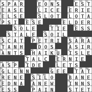 ACROSS 1. Practice fight 5. Immeasurably long periods of time 9. Eastern Standard Time (abbr.) 12. Comfort 13. Louse (plural) 14. 4th largest of the Great Lakes 15. Otherwise 16. Position in a hierarchy or organization 17. Globular water bottle used in Asia 18. 23rd letter of the Greek alphabet 19. Compass dir. 21. A person who is older than you are 22. Not divided or shared with others 24. Standoff 26. Curvy letter 27. Showing deterioration from age 28. The visible part of the earth's surface 29. Scram, to a cat 30. _ dish (used to culture cells) 32. "Two Mules for Sister ____" 36. Hyperbolic tangent 37. Two (Sp.) 38. SW Saudi Arabia district 39. Pismires 40. Japanese verse 42. Capri or Wright 43. Baby powder 44. Bert's buddy 46. Viper 49. Binary compound 50. Allows 51. American astronaut and politician John 53. Unit of force equal to gravity 54. Make lace 57. French philosopher Descartes 58. Grain storage tower 61. Object of repulsion 62. Pulitzer Prize-winning author Ferber 63. Afresh 64. Restaurants 65. Double-curved letter 66. Ache 67. Proofreading order DOWN 1. Ooze 2. Friends 3. Aide 4. To sift 5. Otherwise 6. Petroleum 7. Non-commissioned officer (abbr.) 8. Arrange properly for use 9. Eat (away) 10. Locates 11. Lacerates 14. Pipe bend 19. Pipe bend 20. Ooze 21. Snakelike fish 23. Profane or obscene expressions 24. Cod relative 25. One more than two 27. Glance over 28. Unemotional 29. R.R. building 31. Peak District village in England 32. Virtuous person 33. Helper 34. Cause heat under the collar 35. "We ___ not amused" (Victoria) 40. Possessed 41. Ubangi River tributary 43. Metal container 45. Portuguese money of account (variant) 46. Match 47. Bobsleighs 48. Actor Sean's family 52. Teachers' org. 53. Bride's dress 55. Queen of England 1702-14 56. Trial 58. Plant excrement 59. _ tizzy (2 wds.) 60. Flowery wreath 61. Altar cloth linen