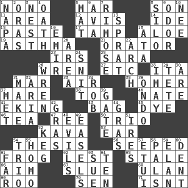 ACROSS 1. Words to Nanette 5. Third mo. 8. Male child 11. Length times width 12. Advice 14. Binary compound 15. Thick mixture 17. Pack (down) 18. Medicinal plant 19. Respiratory problem 21. Speaker 23. Big collection agency 25. "Two Mules for Sister ____" 26. Songbird 27. And so on (abbr.) 28. Call ___ day 31. Third mo. 33. Wind 35. Simpsons dad 37. Female horse 38. Coat; cloak 40. Nathan's nickname 41. Supplementing with great effort 43. Container for groceries 45. Color 46. Beverage made from leaves 47. To separate or throw off 50. Musical group of three 52. Polynesian shrub of the pepper family 53. Ewer handle 54. College paper 56. Oozed 61. Tree-dwelling hopper 62. For fear that 65. Showing deterioration from age 66. Direct toward a target or goal 67. Turn sharply 68. Uhlan (variant) 69. Friend of Pooh 70. Elected rep. 71. Is not DOWN 1. California wine valley 2. Mouths or openings 3. Egg locale 4. Pledge 5. Floor protector 6. Actress Gardner 7. Full of chinks, cracks, or crevices 8. Grain storage tower 9. Aroma 10. Born 13. Small fatty European fish 16. Arab leader 18. _ moment's notice (2 wds.) 20. Type of rug 22. Bowlike part 24. In a ____ (agitated or irritated) 26. Songbird 28. "If ____ say so..." 29. Wig 30. "We ___ not amused" (Victoria) 31. Create 32. Operatic vocal solo 34. Director Reiner 36. Southwest Nigerian state 37. Was introduced to 39. Yard entry 42. Pate de foie ____ 44. Pate de foie ____ 48. Vices 49. Artist's stands 51. Angers 52. Cask 54. Musical group of three 55. Same (prefix) 57. Needle holder 58. Friends 59. Enthusiasm 60. Gouge 61. At a great distance 63. Take to court 64. Nine, plus one