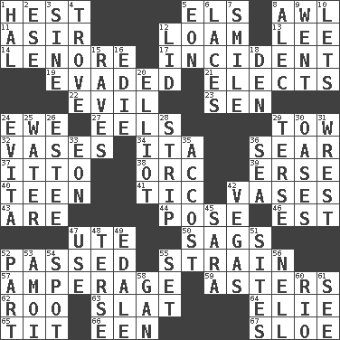 ACROSS 1. Command 5. Raised railways 8. Leather borer 11. SW Saudi Arabia district 12. Rich soil 13. Area sheltered from the wind 14. Poe poem 17. Event 19. Eluded 21. Opts 22. Tending to cause great harm 23. Elected rep. 24. She-sheep 27. Snakelike fish 29. Pull behind 32. Flower holders 34. Call ___ day 36. Burn superficially 37. "Tell ____ the Marines!" 38. The grampus (Milton) 39. Celtic language 40. Adolescent 41. Nervous spasm 42. Flower holders 43. "We ___ not amused" (Victoria) 44. Introduce or present, as a question 46. Eastern Standard Time (abbr.) 47. Shoshoni 50. Droops 52. Went by 55. Put through a sieve 57. Electrical Measurement 59. Michaelmas daisies 62. Friend of Pooh 63. Narrow board 64. Writer Wiesel 65. Teat (slang) 66. Car or cant ending 67. _ gin DOWN 1. Actor Linden 2. Compass dir. 3. Trig term 4. Collection of objects 5. Age 6. Shoestrings 7. Grin 8. Actor Baldwin 9. Left 10. Allows 12. Hat (slang) 15. All-night dance parties 16. Singer Brickell 18. Lair 20. American author Paul (1891-1958) 24. Webber/Rice musical 25. Wetness 26. First name in cosmetics 28. Remove all contents or possession from 29. Laconic 30. Fertile tracts in a desert 31. Take or capture by force 33. Age 35. Buttonhole 36. Ocean 42. Viva Las _ 45. "Two Mules for Sister ____" 47. Purpose 48. Laconic 49. Peak District village in England 51. Locates 52. Role in a play 53. Mine, in Marseilles 54. Specific locale 55. Arrange properly for use 56. 1994 drama film starring Jodie Foster 58. Separate the seeds from cotton 60. River (Sp.) 61. Observe
