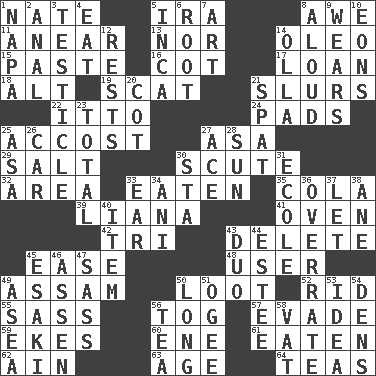 ACROSS 1. Nathan's nickname 5. Lyricist Gershwin 8. Deep reverence 11. Approach 13. Or not 14. Butter sub 15. Thick mixture 16. Small bed 17. Grant temporary use of 18. Keyboard modifier key 19. Scram, to a cat 21. Disparaging remarks 22. "Tell ____ the Marines!" 24. Writing tablets 25. Buttonhole 27. White ___ sheet 29. Table seasoning 30. Snake scale 32. Type of rug 33. Consumed 35. Root beer relative 39. Woody, climbing, usually tropical plant 41. Baking chamber 42. Three (prefix) 43. Keyboard key 45. Comfort 48. One who uses or employs something 49. Indian state 50. Plunder 52. To free from 55. Backtalk 56. Coat; cloak 57. Dodge 59. Supplements with great effort 60. Compass dir. 61. Consumed 62. The 18th letter of the Arabic alphabet 63. Ripen 64. Beverages made from leaves DOWN 1. California wine valley 2. Of or related to the anus 3. A testis 4. Consume 5. South American Indian 6. Carrot, for example 7. Nonscientific branch of learning 8. Verbally 9. Erodes 10. Immeasurably long periods of time 12. Musical pauses 14. Water jar 20. Small bed 21. Petty quarrel 23. Add up to 25. White ___ sheet 26. Automobile 27. Adept person 28. Player for Phoenix 30. R.R. building 31. Learning spot: Fr. 33. Ewer handle 34. Black tropical American cuckoo 36. Make much ado about nothing 37. Allow 38. One (Scot) 40. A whole individual unit 43. Superhero pair 44. First name in cosmetics 45. 1973 Nobel Price Winner (Physics) Leo 46. NE Netherlands city 47. Backtalk 49. Toward the sea 50. Having great length 51. Double curve, resembling the letter S 53. The main thing one is thinking about 54. Hiding places for outlaws 56. Afternoon social gathering 58. Large container