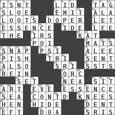 ACROSS 1. Is not 5. Flaplike covering 8. Label 11. A type of plum 12. Give off 14. In the manner of 15. Plunders 17. Drug addict 18. Allow 19. Substance 21. Binary compound 22. Area sheltered from the wind 23. Definite Article 24. Big collection agency 25. Krazy ___ of comics 27. Luau course 28. Floor protectors 31. Fastener 35. 23rd letter of the Greek alphabet 37. Toward shelter 38. Expression of disdain 39. Three (prefix) 41. Emitted 42. In addition 43. Indian title of respect (Mr.) 45. Fast planes 46. It's straight from the horse's mouth 47. The grampus (Milton) 49. Arrange properly for use 51. Teachers' org. 52. Be seated 55. Nonscientific branch of learning 57. Night before a holiday 60. Substance 62. Ocean 63. Continued (abbr.) 65. Leg joints 66. Layer 67. Flintstone garb 68. Gouge 69. Newt 70. ___ good deed 71. Indian titles of respect DOWN 1. Small island 2. Make a splashing sound 3. Trap for birds or small mammals 4. False hair 5. Lion 6. Body of Kaffir warriors 7. Passed on 8. Baron Munchausen's specialties 9. Toward shelter 10. Yard entry 13. Long journey 16. Clip 17. Stop 20. Riding implement 26. Collect or gather 29. Portable shelter 30. Arranges properly for use 31. Practice fight 32. Mediterranean tributary 33. Helper 34. Give a jingle 36. Big collection agency 40. Pressed 44. Angers 48. Keg 50. Technical 52. Scornful expression 53. Ancient Celtic tribe of eastern Britain 54. Trials 55. American tennis player Robert 56. Coral ridge 58. Lacking any legal or binding force 59. Inside; within (prefix) 61. Conclusions 64. Beverage made from leaves