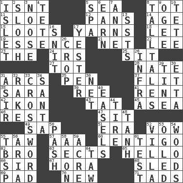 ACROSS 1. Is not 5. Ocean 8. Small child 11. _ gin 12. Zero-star reviews 14. Mature 15. Plunders 17. Entertaining tales 18. Allow 19. Gist 21. Fish or hair follower 22. Area sheltered from the wind 23. Definite Article 24. Big collection agency 25. Be seated 27. Small child 28. Nathan's nickname 31. Arches 35. Animal enclosure 37. Sudden quick movement 38. "Two Mules for Sister ____" 39. To separate or throw off 41. Monthly bill 42. Image 43. Make lace 45. Toward the sea 46. Repose 47. Be seated 49. Plant excrement 51. Epoch 52. Solemn pledge 55. The 23rd letter of the Hebrew alphabet 57. Auto club (abbr.) 60. Small, flat, pigmented spot on the skin 62. Sis' sibling 63. Religious groups 65. Phone greeting 66. Title for a knight 67. Israeli folk dance 68. Downhill vehicle 69. Writing tablet 70. ___ Haven, CT 71. Small boys DOWN 1. Small island 2. Agitate, as a liquid 3. Trap for birds or small mammals 4. False hair 5. Health resort 6. Merit 7. Singer Murray 8. Baron Munchausen's specialties 9. Double curve, resembling the letter S 10. Wig 13. Fast planes 16. In a ____ (agitated or irritated) 17. Of or pertaining to yesterday 20. Riding implement 26. Kind of red light 29. Prong on a fork 30. Singer James 31. SW Saudi Arabia district 32. Immoral or dissolute person 33. What you're doing now 34. Before Barbara or Clara 36. Fish or hair follower 40. Artist's stands 44. Hoop that covers a wheel 48. Hyperbolic tangent 50. Romantic infatuation 52. Country estate 53. Stared 54. Forest 55. Cook's measure (abbr.) 56. Roberta Peters solo 58. A really long time 59. 43,560 square feet 61. Trial 64. The 23rd letter of the Hebrew alphabet