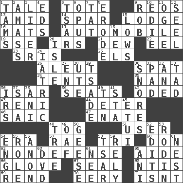 ACROSS 1. Lie 5. Carryall 9. Vintage cars 13. Among 14. Practice fight 15. Inn 16. Floor protectors 17. Car 19. Compass dir. 20. Big collection agency 21. Morning condensation 22. Snakelike fish 23. Indian titles of respect 25. Raised railways 26. Native American of Southwest Alaska 30. Argument over a trivial matter 34. Portable shelters 35. Nanny 36. Astrian river, tributary to the Danube 39. Theater features 42. Wrote a lyric poem 43. Painter Guido (1575-1642) 44. Prevent from occurring 46. Ketch in the Levant 47. Related on the mother's side 48. Coat; cloak 51. One who makes use of a thing 54. Epoch 57. Actress Charlotte 58. Three (prefix) 60. Spanish title 62. Unrelated to defense, as in spending 65. Assistant 66. Michael Jackson trademark 67. Lick closed 68. Nuclear Threat Initiatives 69. Tear apart 70. Suggestive of the supernatural 71. Is not DOWN 1. Scottish caps 2. Collect or gather 3. 61 cubic inches 4. Begley and Asner 5. Russian ruler of old 6. Musical composition 7. Make lace 8. Eat (away) 9. Director Reiner 10. Singer Brickell 11. Stare at amorously 12. Sew up the eyelids of hawks and falcons 15. Moos 18. Cartoonist voice _ Blanc 20. Capri or Wright 24. Of or pertaining to medicine 27. Followers of ems 28. Shoshoni 29. Sadhe (variant) 30. Sounds asleep 31. Groovy apt. 32. A saturated hydrocarbon 33. Small boy 36. Big collection agency 37. Ocean 38. Cuckoo 40. "___ Little Indians" 41. R.R. building 45. Needle holder 48. Family _ (genealogy) 49. Clumsy lout 50. Honkers 52. Proofreads 53. "The Thinker" sculptor 54. Engineer (abbr.) 55. Hero or heavy, e.g. 56. At once, immediately (arch.) 58. Russian ruler of old 59. Have trust in 61. Egg locale 63. Movie disc 64. Born 65. Cuckoo