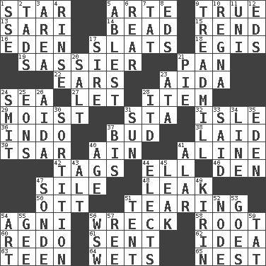 ACROSS 1. Play the lead 5. Johnson of "Laugh-In" 9. Loyal 13. Indian skirt 14. Necklace unit 15. Tear apart 16. Locale of original sin 17. Narrow boards 18. Armor plate that protects the chest 19. More disrespectful 21. Baking dish 22. Hearing organs 23. Opera by Verdi 24. Ocean 27. Allow 28. A whole individual unit 29. Damp 31. R.R. building 32. Small island 36. _ china 37. Partially opened flower 38. Put down 39. Russian ruler of old 40. The 18th letter of the Arabic alphabet 41. Place in a line 42. Labels 44. Pipe bend 46. Lair 47. Filth; sediment 48. Path through which fluid escapes 50. Baseball player Mel 51. Rending 54. Hindu god of fire 56. Raze 58. Carrot, for example 60. Make new 61. Transmitted 62. The content of cognition 63. Adolescent 64. Soaks 65. Egg locale DOWN 1. Compass dir. 2. Small amounts or degrees 3. Type of rug 4. Remove soap 5. Most capable 6. Stern 7. Make lace 8. Begley and Asner 9. Excercise machine 10. Canadian anthropologist Darnell 11. Corn or form start 12. Begley and Asner 17. Father 20. Table seasoning 21. Sliced dessert 23. "One Day ___ Time" 24. Stricken, poetically 25. Immeasurably long periods of time 26. Opera by Verdi 28. It would 30. Making a chance decision by using lots 31. Player for Phoenix 33. Expressed in words 34. Actor's bit 35. Paradise 37. Again 40. Ripen 41. Having or resembling wings 43. Keyboard modifier key 44. Chooses 45. Path through which fluid escapes 47. Message 49. Japanese brewing company 51. Portable shelter 52. Connecting point 53. Leaves 54. Tate display 55. Turn to the right 56. Compass dir. 57. To separate or throw off 59. Make lace