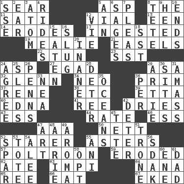 ACROSS 1. Burn superficially 5. Cleo's killer 8. Definite Article 11. Suttee (variant) 12. Small bottle 13. Car or cant ending 14. Eats (away) 17. Consumed 19. Ear of corn 21. Artist's stands 22. Astound 23. Fast jet (abbr.) 24. Viper 27. Mild oath 29. White ___ sheet 32. American astronaut and politician John 34. Modern: prefix 36. Demure 37. French philosopher Descartes 38. And so on (abbr.) 39. Singer James 40. Pulitzer Prize-winning author Ferber 41. To sift 42. Frees from moisture 43. Double-curved letter 44. Pace 46. Curvy letter 47. Auto club (abbr.) 50. Remaining after all deductions 52. A viewer who gazes fixedly 55. Michaelmas daisies 57. Coward 59. Worn away 62. Had dinner 63. Body of Kaffir warriors 64. Nanny 65. Portuguese money of account (variant) 66. Erode 67. Supplemented with great effort DOWN 1. Compass dir. 2. Hearing organ 3. Smallest unit of an element 4. Amusement-park features 5. The 18th letter of the Arabic alphabet 6. Gurus 7. Entreaties 8. Wig 9. Person who is morally reprehensible 10. Extremities 12. Compete 15. Eroded 16. A hard, heavy blow 18. Fast jet (abbr.) 20. More empty; more void 24. Match 25. Bobsleighs 26. Actor Sean's family 28. Prevent from occurring 29. Nick name for Arthur 30. Settings 31. Collect or gather 33. Teachers' org. 35. Seas 36. For each 42. Prevent from occurring 45. False hair 47. Tate display 48. Nest on high 49. Scent 51. Marketplace scale 52. Practice fight 53. Carryall 54. Toward shelter 55. Cuckoo 56. Neighbor of Neb. 58. Choose 60. Compass dir. 61. June honoree