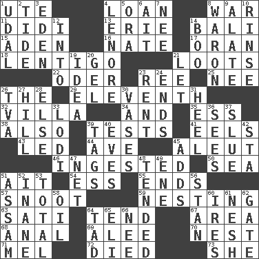 ACROSS 1. Shoshoni 4. Grant temporary use of 8. Armed conflict 11. "You Light Up My Life" star Conn 13. One of the Great Lakes 14. Indonesian resort city 15. Arabian gulf 16. Nathan's nickname 17. NW Algerian seaport 18. Small, flat, pigmented spot on the skin 21. Plunders 22. Baltic tributary 23. To sift 25. Born 26. Definite Article 29. Veterans Day date 32. Country estate 34. Plus 35. Double-curved letter 38. In addition 39. Trials 41. Snakelike fish 43. Directed 44. "___ Maria" 45. Eskimo relative 46. Eaten 50. Ocean 51. Small island 54. Curvy letter 55. Extremities 57. Snob 59. Inhabiting a nest 63. Suttee (variant) 64. Be inclined (to) 67. Length times width 68. Of or related to the anus 69. Toward shelter 70. A home for chicks 71. Cartoonist voice _ Blanc 72. Passed on 73. A female animal or person DOWN 1. Hereditary estate 2. Periodic rise and fall of the sea level 3. Paradise 4. Poe poem 5. Mouth or opening 6. Small island 7. Born 8. Make _____ (do battle with) 9. Having winglike extensions 10. Wash lightly 12. To the inside or interior of 14. Surprise greeting 19. The main thing one is thinking about 20. Set 21. Allow 23. Monthly bill 24. Conclusions 26. Federal power corp. 27. Land elevation 28. Otherwise 30. Flower holders 31. Person who is morally reprehensible 33. Farming town in central California 36. Observes 37. Turn sharply 39. Labels 40. Nights before holidays 42. R.R. building 45. Does sums 47. Fish or hair follower 48. Watched over 49. Compass dir. 51. Indian state 52. Silly 53. "_____ Recall" 56. Comedian Laurel of Laurel & Hardy 58. Petroleum 60. Angers 61. Tender 62. Yard entry 64. Small boy 65. Biblical high priest 66. Born