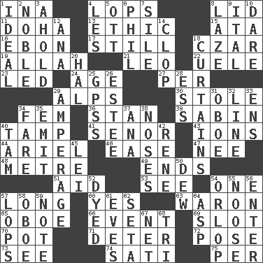 ACROSS 1. _ tizzy (2 wds.) 4. Chops off 8. Hat (slang) 11. Capital of the state of Qatar 13. Value system 15. "One Day ___ Time" 16. Inky black, to poets 17. Free from disturbance or agitation 18. Russian ruler of old 19. Assad's deity 21. Lion 22. Ubangi River tributary 23. Directed 24. Mature 27. For each 29. High mountains 30. Fur scarf 34. Opposite of masc. 36. Comedian Laurel of Laurel & Hardy 39. Unit of acoustic absorption 40. Pack (down) 41. Sir (Sp.) 43. Charged atoms 44. Satellite of Uranus 46. Comfort 47. Born 48. Distance measurement (Brit.) 49. Extremities 51. Assist 53. Perceive with the eye 54. Single 57. Having great length 60. Consenting reply 63. Make _____ (do battle with) 65. Mitch Miller's instrument 66. Happening 69. Notch 70. Plant holder 71. Prevent from occurring 72. Airs 73. Perceive with the eye 74. Suttee (variant) 75. For each DOWN 1. Standard of perfection 2. Impressive in appearance 3. Hold, grip (Informal) 4. French article 5. Baseball player Mel 6. Silvers or Donahue 7. Drop; flow; fall 8. Goldbrick 9. Slanted text style (abbr.) 10. Have the gumption 12. Santa ___, CA 14. Hoof sound 18. Window treatments 20. Actor Linden 25. Global Positioning Systems (abbr.) 26. First name in cosmetics 28. Curvy letter 29. Electrical Measurement 31. Mitch Miller's instrument 32. Actor's bit 33. Followers of ems 34. Conductor's collection 35. Send forth 37. Santa ___, CA 38. Olfactory organs 40. Scottish cap 42. French philosopher Descartes 45. Luau accessory 50. Morning condensation 52. Colored 54. Lowest deck of a ship 55. Trap for birds or small mammals 56. Keyboard key 57. Chops off 58. Mitch Miller's instrument 59. Observe 61. Nights before holidays 62. Bristle 64. Viper 67. Fish or hair follower 68. Three (prefix)