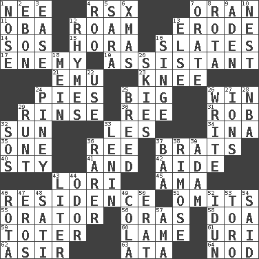ACROSS 1. Born 4. Acura sports coupe 7. NW Algerian seaport 11. Chief or king in Benin or Nigeria 12. Wander 13. Wear away 14. Mayday 15. Israeli folk dance 16. Chalkboards 17. Foe 19. Aide 21. Australian flightless bird 23. Leg joint 24. Sliced desserts 25. Of large size 26. Acquire through effort 29. Remove soap 30. To sift 31. Director Reiner 32. Player for Phoenix 33. French article 34. _ tizzy (2 wds.) 35. Single 36. Portuguese money of account (variant) 37. Naughty children 40. Filthy place 41. Plus 42. Helper 43. Australian parrot (variant) 45. Nursemaid (var.) 46. Home 51. Leaves out 55. Speaker 56. Mouths or openings 58. ___ good deed 59. Carrier 60. Unable to walk 61. RI univ. 62. SW Saudi Arabia district 63. _ moment's notice (2 wds.) 64. Lower and raise head in agreement DOWN 1. Characteristic smell of wine 2. Inky black, to poets 3. Relaxation 4. Friend of Pooh 5. "Two Mules for Sister ____" 6. Dec. holiday 7. Declaim 8. Roll call or roster of names 9. An important port of Yemen 10. Egg locale 12. Poems 13. Otherwise 16. Scorch 18. Chow _ 20. Atmospheres 22. Purpose 24. Abounding in pines 25. A special lineage 26. Compose 27. Charged atoms 28. Basketball assoc. 29. Undersized animal 32. Distress signal 33. Soviet premier 1918-24 36. Less widely known 37. Sound made by sheep 38. Full of chinks, cracks, or crevices 39. First man 43. 61 cubic inches 44. Scent 46. Round or rotation of duties 47. Greek god of love 48. Suttee (variant) 49. Root beer relative 50. Part of Q.E.F. 52. Goddess of spring and wife of Bragi 53. "Corrida" creature 54. Stated 57. Wet nurse (var.)