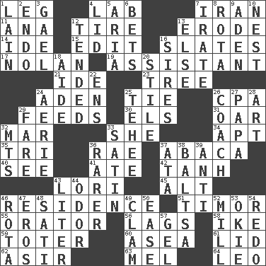 ACROSS 1. Part of a journey 4. Experiment locale 7. SW Asia republic 11. Santa ___, CA 12. Become fatigued 13. Eat (away) 14. Binary compound 15. Prepare for publication 16. Chalkboards 17. Pitcher Ryan 19. Helper 21. Binary compound 23. Woody plant 24. An important port of Yemen 25. Standoff 26. Tax preparer (abbr.) 29. Gives food to 30. Raised railways 31. Rowing implement 32. Impair 33. A female animal or person 34. Fitting 35. Three (prefix) 36. Actress Charlotte 37. Phillipine bananalike plant 40. Perceive with the eye 41. Had dinner 42. Hyperbolic tangent 43. Australian parrot (variant) 45. Keyboard modifier key 46. Dwelling 51. The easternmost of the Lesser Sundas 55. Speaker 56. Straggles 58. D.D.E's nickname 59. Carrier 60. Toward the sea 61. Hat (slang) 62. SW Saudi Arabia district 63. Cartoonist voice _ Blanc 64. Lion DOWN 1. (Had) reclined 2. Inside; within (prefix) 3. Highlander 4. Flaplike covering 5. Roberta Peters solo 6. Wagers 7. Feeling or showing extreme anger 8. Round or rotation of duties 9. An important port of Yemen 10. A home for chicks 12. Looked after 13. Otherwise 16. Titles for men of rank and authority 18. Assistant 20. Vertical member of a panel or frame 22. Followers of ems 24. Nest on high 25. Giggle 26. Team commander 27. Dad 28. Nonscientific branch of learning 29. Conductor's collection 32. Mountains (abbr.) 33. Smooth fabric 36. More uncommon 37. _ moment's notice (2 wds.) 38. Greek mezzo-soprano Agnes 39. Opposed to 43. 61 cubic inches 44. Aroma 46. Round or rotation of duties 47. Greek god of love 48. Suttee (variant) 49. Dollar (slang) 50. Comfort 52. Place where flour is made 53. Migrant worker of the '30s 54. Redecorate 57. Set