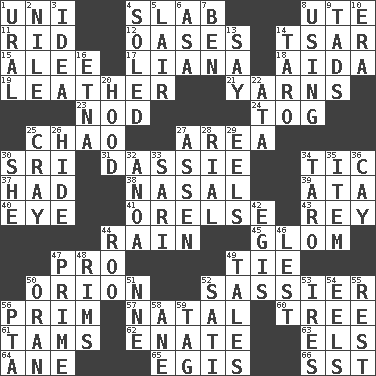 ACROSS 1. Single; one (prefix) 4. Thick slice 8. Shoshoni 11. To free from 12. Fertile tracts in a desert 14. Russian ruler of old 15. Toward shelter 17. Climbing, woody, usually tropical vines 18. Opera by Verdi 19. Cordwainer's material 21. Entertaining tales 23. Allow head to fall sleepily 24. Coat; cloak 25. US Secretary of Labor Elaine L. _ 27. Length times width 30. _ Lanka 31. Small ungulate mammals of Africa 34. Nervous spasm 37. Possessed 38. Rhinal 39. _ moment's notice (2 wds.) 40. Sight organ 41. Threatening words 43. Marina Del _, California 44. Water falling in drops from the sky 45. Seize upon or latch onto something 47. Adept person 49. Standoff 50. Greek mythologigal hunter 52. More disrespectful 56. Demure 57. Brizilian seaport 60. Relationship diagram 61. Scottish caps 62. Maternal 63. Raised railways 64. One (Scot) 65. The front part of a cuirass 66. Fast jet (abbr.) DOWN 1. Mountain range 2. Mediterranean tributary 3. The main thing one is thinking about 4. Having a sole or soles 5. Den 6. White ___ sheet 7. Benjamin's nick name 8. Putting into practice 9. Small amounts or degrees 10. Epoch 13. Declare 14. Pacific island yam 16. Inactive volcano in Sicily 20. Parka part 22. _ moment's notice (2 wds.) 25. Supercomputer manufacturer 26. Flintstone garb 27. NE Netherlands city 28. Monetary unit of Yemen 29. Snakelike fish 30. A female animal or person 32. Small Philippine buffalo 33. Indian skirt 34. Pacific island yam 35. A whole individual unit 36. Island 42. Armor plate that protects the chest 44. Friend of Pooh 46. For fear that 47. A-one 48. Basketball hoops 49. Lies 50. NW Algerian seaport 51. Compass dir. 52. Suttee (variant) 53. Angers 54. Snakelike fish 55. Take ten 56. Parent Teacher Association (abbr.) 58. A saturated hydrocarbon 59. Label