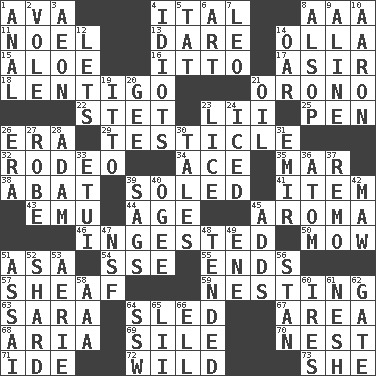 ACROSS 1. Actress Gardner 4. Slanted text style (abbr.) 8. American Automobile Association (abbr.) 11. Christmas carol 13. Have the gumption 14. Water jar 15. _ vera 16. "Tell ____ the Marines!" 17. SW Saudi Arabia district 18. Small, flat, pigmented spot on the skin 21. U. of Maine site 22. Proofreading order 23. Cards in a Roman deck? 25. Writing instrument 26. Epoch 29. One of the two male reproductive glands 32. Cowboy competition 34. Adept person 35. Impair 38. Blind as ____ 39. Having a sole or soles 41. A whole individual unit 43. Australian flightless bird 44. Grow older 45. Odor 46. Consumed 50. Cut the grass 51. White ___ sheet 54. Compass dir. 55. Extremities 57. To gather and bind into a bundle 59. Inhabiting a nest 63. "Two Mules for Sister ____" 64. Downhill vehicle 67. Length times width 68. Roberta Peters solo 69. Drop; flow; fall 70. A home for chicks 71. Binary compound 72. Uncontrolled 73. A female animal or person DOWN 1. Of or related to the anus 2. Short-tailed, large-bodied rat 3. A really long time 4. Foolish or stupid persons 5. Make lace 6. Tate display 7. Lion 8. Columnist Joseph or Stewart 9. Place in a line 10. Composer Copland 12. Allows 14. Rowing implement 19. "Tell ____ the Marines!" 20. Turn to the right 21. Petroleum 23. Louse (plural) 24. On the rocks 26. Epoch 27. Loose flowing garment 28. First of billions? 30. Falsehoods 31. Independent ruler or chieftain 33. Needle holder 36. Smallest unit of an element 37. San ____ (Riviera town) 39. Sinks 40. Double curve, resembling the letter S 42. Informal term for the mouth 45. Sums up 47. Science/research agcy. 48. Watched over 49. Compass dir. 51. Slender Brazilian palm 52. Pottery fragment 53. Nest on high 56. Comedian Laurel of Laurel & Hardy 58. American Automobile Association (abbr.) 60. Angers 61. Delicate 62. Yard entry 64. Compass dir. 65. Cards in a Roman deck? 66. Pipe bend