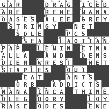 ACROSS 1. Slender fish 4. To draw with force 8. On the rocks 12. "We ___ not amused" (Victoria) 13. French philosopher Descartes 14. Grandmother 15. Fertile tracts in a desert 18. Toward shelter 19. Jennifer or Joel 20. Slender, wiry 22. Fish or hair follower 23. Not divided or shared with others 24. Personal Computers (abbr.) 25. Ocean 26. Of or relating to Laos or its people 30. Infant food 33. Soviet premier 1918-24 36. Inactive volcano in Sicily 37. Silent film actress Nazimova 39. Added to 40. Hiding places for outlaws 41. South Vietnam president (1954) 42. Obtain by seizing forcibly or violently 44. Was introduced to 45. Paper fasteners 47. Fr. "Yes" 50. Consume 51. Pismires 53. Globe 54. Inveterate users 57. Nanny 59. South American Indian 61. One or ones belonging to thee 63. Cassini of fashion 64. Rowboat 65. Myrna of the movies 66. To erase 67. Lyric poems 68. She-sheep DOWN 1. E Mali city 2. Ancient river in northeast Turkey 3. Musical pauses 4. To be drawn or hauled along 5. Have confidence or faith in 6. One (Scot) 7. Unit of force equal to gravity 8. Swallowed 9. Draw slowly or heavily 10. Compass dir. 11. 24 hours 16. Greek god of love 17. Filth; sediment 21. Anneal 22. Non-commissioned officer (abbr.) 24. Baking dish 26. Flaplike coverings 27. A whole individual unit 28. Queen of England 1702-14 29. Political cartoonist Thomas 30. Writing tablets 31. Set down 32. Entreaty 34. Hearing organs 35. Compass dir. 38. Electrical Measurement 42. Soggy 43. Frog relative 46. Experiment locale 48. A single undivided whole 49. Hankering 52. Vertical member of a panel or frame 53. Washington bills 54. 43,560 square feet 55. 24-hour periods 56. Overwhelm 57. Not either 58. Chicken ___ king 59. Wedding promise 60. Allow head to fall sleepily 62. Sight organ