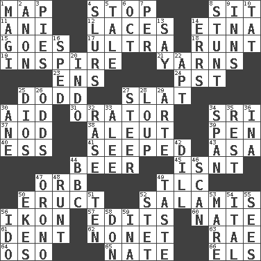 ACROSS 1. Atlas unit 4. Halt 8. Be seated 11. Black tropical American cuckoo 12. Shoestrings 14. Inactive volcano in Sicily 15. Leaves 17. Extreme 18. The smallest animal of a litter 19. Motivate 21. Tall tales 23. Followers of ems 24. Pacific Standard Time (abbr.) 25. Texas town _ City 27. Narrow board 30. Assist 31. Speaker 34. _ Lanka 37. Lower and raise head in agreement 38. Eskimo relative 39. Animal enclosure 40. Double-curved letter 41. Oozed 43. White ___ sheet 44. Fermented drink made from hops 45. Is not 47. Globe 49. Affectionate concern, for short 50. Spew [out] 52. Deli grouping 56. Image 57. Prepares for publication 60. Nathan's nickname 61. Scratch 62. Music written for nine 63. Actress Charlotte 64. Bear (Spanish) 65. Nathan's nickname 66. Raised railways DOWN 1. Wise men 2. Soon (poet.) 3. Sliced desserts 4. Runs notes together 5. Story 6. Sep. follower 7. For each 8. Check the growth or development of 9. Lodging establishments 10. Make lace 13. Declare 14. Blunders 16. Broke a traffic law 20. _ china 22. Fitting 25. "Vaya con ____" 26. Likelihood 27. Navigate 28. Central Nebraska county 29. Johnson of "Laugh-In" 30. One (Scot) 32. Raze (variant) 33. Toward shelter 34. Connect, as a bridge 35. Respite 36. _ tizzy (2 wds.) 42. Deli pickle 44. English channel? 46. Glance over 47. U. of Maine site 48. Undersized animal 49. Clothes sense 50. Makes supply last 51. Nine, plus one 52. Proofreading order 53. Female horse 54. Slanted text style (abbr.) 55. Perceives with the eye 56. Wedding promise 58. Spanish title 59. _ tizzy (2 wds.)