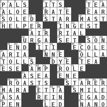 ACROSS 1. Friends 5. ___ a Wonderful Life 8. Afternoon social gathering 11. Medicinal plant 12. Pace 14. Hearing organ 15. Having a sole or soles 17. Play the lead 18. Vertical spar for supporting sails 19. Aide 21. Eat 23. Wind 25. Monetary unit of Yemen 26. Capital and largest city of Mongolia 27. Arrange properly for use 28. Male offspring 31. Conclude 33. One more than two 35. Learning spot: Fr. 37. Operatic vocal solo 38. Compass dir. 40. Rounded earthenware pot or jar 41. For Whom the Bell _____ 43. Color 45. Beverage made from leaves 46. Compass dir. 47. Electrical Unit 50. Hero or heavy, e.g. 52. Toward the sea 53. Compass dir. 54. Ridicules or criticizes harshly 56. A viewer who gazes fixedly 61. Hindu Mythology: god of death 62. Singer James 65. Grin 66. White ___ sheet 67. It's straight from the horse's mouth 68. Mild oath 69. Writing instrument 70. Directed 71. Billionth: prefix DOWN 1. Romantic infatuation 2. _ vera 3. Hang loosely or laxly 4. Ooze 5. Big collection agency 6. Make lace 7. Flight of steps 8. Beverages made from leaves 9. 90 degrees 10. Tate display 13. Bert's buddy 16. Letter starter 18. Cartoonist voice _ Blanc 20. Swiss mountan, "Queen of the Mountains" 22. Yard entry 24. Precipitation 26. Hereditary estate 28. Flatfish 29. Water jar 30. Teachers' org. 31. Greek god of love 32. Mediterranean tributary 34. Indiana (abbr.) 36. ____ d'Azur (French Riviera) 37. Had dinner 39. Jane of fiction 42. Backtalk 44. Immeasurably long periods of time 48. Distance measurement 49. Soft color 51. Allows 52. American Automobile Association (abbr.) 54. Raze (variant) 55. Northwest Algerian city 57. So be it 58. Port city in Latvia 59. Liveliness 60. Do over again 61. Atlas unit 63. Make a knot 64. Also