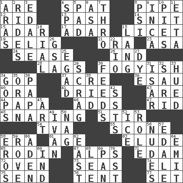 ACROSS 1. "We ___ not amused" (Victoria) 4. Petty quarrel 8. Corncob 12. To free from 13. Romantic infatuation 14. In a ____ (agitated or irritated) 15. The sixth month of the Jewish calendar 17. The sixth month of the Jewish calendar 18. It is permitted: Lat. 19. Major League Baseball Commissioner Bud 21. Mouth or opening 23. White ___ sheet 24. Gospel singer Marvin 26. Indiana (abbr.) 28. Straggles 30. Out of fashion; old fashioned 34. Republican Party 37. 43,560 square feet 39. Son of Isaac 40. Mouth or opening 41. Frees from moisture 43. "We ___ not amused" (Victoria) 44. Dad 46. Sums up 47. To free from 48. Catching in a trap 51. Use a spoon 54. Federal power corp. 55. Biscuitlike quick bread 58. Epoch 61. Personal question 63. Dodge 65. "The Thinker" sculptor 67. High mountains 71. Dutch treat 72. Baking chamber 73. Oceans 74. Biblical high priest 75. Post 76. Portable shelter 77. Put into a specified state DOWN 1. Ancient river in northeast Turkey 2. Amusement-park features 3. Peak District village in England 4. Health resort 5. Groovy apt. 6. White ___ sheet 7. Through, poetically 8. Air pressure measure (abbr.) 9. South American Indian 10. Sliced desserts 11. Singer James 16. Monetary unit of Yemen 18. Long (Scottish) 20. Girls' org. (abbr.) 22. _ de Janeiro 25. Mild oath 27. Color 29. Strangle with an iron collar 30. Gives food to 31. Astrian river, tributary to the Danube 32. Indian skirt 33. Took on color 34. Republicans 35. Northwest Algerian city 36. Dad 38. To free from 42. Fast planes 45. Tate display 49. _ the terrible 50. Tired old horse 52. Frozen water 53. Hero or heavy, e.g. 56. Unclothed pictures 57. Peak District village in England 58. Greek god of love 59. Be footloose 60. An important port of Yemen 62. Compass direction 64. Send forth 66. Indiana (abbr.) 68. Area sheltered from the wind 69. Baking dish 70. Fast jet (abbr.)