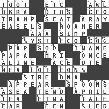 ACROSS 1. A blast of a horn 5. And so on (abbr.) 8. Leather borer 11. Gumbo ingredient 12. "Vaya con ____" 14. Corporate head (abbr.) 15. _____ steamer (cargo ship) 17. Jazz singing style 18. Like ___ of sunshine 19. Artist's stands 21. Wanderer 23. Auto club (abbr.) 25. Simple or foolish person 26. System (abbr.) 27. Environmental prefix 28. Gear tooth 31. Infant food 33. "Barney Miller" actor Jack 35. Empty; void 37. Dad 38. Medical imaging device (abbr.) 40. Single time 41. Place in a line 43. Adept person 45. Shoshoni 46. Teachers' org. 47. Car dealer's back yard 50. Immeasurably long periods of time 52. Father 53. Heredity factor (abbr.) 54. Become visible 56. Soup utensils 61. Toward the sea 62. Be inclined (to) 65. Showery time 66. Beverage made from leaves 67. Inactive volcano in Sicily 68. Story 69. Hearing organ 70. Car or cant ending 71. Downhill vehicle DOWN 1. Carry 2. Gumbo ingredient 3. Mouths or openings 4. Docile 5. Begley and Asner 6. Nervous spasm 7. Rough 8. Measure of real estate 9. Erode 10. Myrna of the movies 13. Unemotional 16. Shaw product 18. Electrical Unit 20. Backtalk 22. Mine, in Marseilles 24. Smallest unit of an element 26. Connect, as a bridge 28. Patter 29. At one time in the past 30. Turn to the right 31. Light colored 32. Capital of Western Samoa 34. Mouth or opening 36. Common sense 37. Baking dish 39. On the rocks 42. Writer Wiesel 44. Immeasurably long periods of time 48. Declaim 49. Cylindrical with tapered ends 51. California wine valley 52. Health resort 54. At sea 55. Lightbulb-shaped fruit 57. Elects 58. Spoken 59. Mediterranean tributary 60. Downhill vehicle 61. Had dinner 63. Compass dir. 64. Daniel's nick name