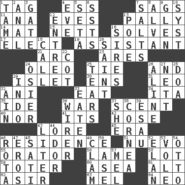 ACROSS 1. Label 4. Double-curved letter 7. Settles 11. Santa ___, CA 12. Nights before holidays 13. Friendly 14. Floor covering 15. Remaining after all deductions 16. Finds the solution 17. Opt 19. Aide 21. Curve 23. Ancient Greek god of war 24. Margarine 25. Make a knot 26. Plus 29. Small island 30. Followers of ems 31. Lion 32. Cuckoo 33. Ingest 34. Call ___ day 35. Binary compound 36. Armed conflict 37. Odor 40. And not 41. It is 42. Flexible conduit 43. Old wives' tales, e.g. 45. Epoch 46. Dwelling 51. New (sp.) 55. Speaker 56. Unable to walk 58. Car dealer's back yard 59. Carrier 60. At sea 61. Keyboard modifier key 62. SW Saudi Arabia district 63. Cartoonist voice _ Blanc 64. Modern: prefix DOWN 1. Not wild 2. Of or related to the anus 3. Yard entry 4. First lady 5. Bristle 6. Fast planes 7. Table seasonings 8. Inventor's middle name 9. Small, secluded valley 10. System (abbr.) 12. Main course 13. Airs 16. Male parents of animals 18. Give a ring to 20. Virtuous person 22. Small bed 24. Flexible twig of a willow tree 25. Pulls into pieces 26. Place in a line 27. Remaining after all deductions 28. ___ good deed 29. _ china 32. The 18th letter of the Arabic alphabet 33. Ingested 36. One who wires 37. A female animal or person 38. Pupil covering 39. He sold his birthright 43. 61 cubic inches 44. Scent 46. Round or rotation of duties 47. Greek god of love 48. Suttee (variant) 49. Burrowing marine mollusk 50. Comfort 52. Flair 53. Grand slam 54. Von Bismarck 57. Cartoonist voice _ Blanc