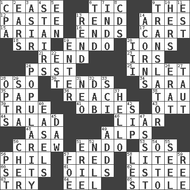 ACROSS 1. Desist 6. Nervous spasm 9. Definite Article 12. Thick mixture 13. Tear apart 14. Ancient Greek god of war 15. Believer in; advocate of (suffix) 16. Conclusions 17. Draw slowly or heavily 18. _ Lanka 19. Inside; within (prefix) 20. Charged atoms 21. Tear apart 23. Big collection agency 24. Inconspicuous attention getter 25. An arm off of a larger body of water 28. Bear (Spanish) 30. Watches over 34. "Two Mules for Sister ____" 35. Infant food 36. Arrive at 38. The 19th letter of the Greek alphabet 39. Loyal 41. Off-Broadway awards 43. Baseball player Mel 44. First course 46. One who doesn't tell the truth 48. White ___ sheet 49. High mountains 50. Ship's personnel 51. Inside; within (prefix) 53. Distress signal 56. Silvers or Donahue 57. Flintstone 58. 61 cubic inches 60. Puts into a specified state 61. Lubricates 62. First name in cosmetics 63. Attempt to accomplish something 64. Snakelike fish 65. Took without asking DOWN 1. Accounting whiz (abbr.) 2. Hearing organs 3. SW Saudi Arabia district 4. Flight of steps 5. Car or cant ending 6. Watch over 7. _ china 8. Music discs 9. Interpreter 10. Possessive pronoun 11. Eastern Standard Time (abbr.) 13. Tear apart 14. Oak nuts 19. Keyboard key 20. One more than two 22. Eastern Standard Time (abbr.) 24. Teen's desire 26. Part of Q.E.F. 27. Pulled tight 28. Elects 29. "Two Mules for Sister ____" 31. Modern: prefix 32. Small moist lump or mass 33. _-fi 37. Phone greeting 40. Artist's stands 42. Small drink 45. Simpleton 47. Aid 49. Sums up 50. "Mermaids" star 51. One of the Great Lakes 52. 1994 drama film starring Jodie Foster 54. "Beetle Bailey" pooch 55. Stitch closed the eyes of (a falcon) 56. Pacific Standard Time (abbr.) 57. Enemy 58. French article 59. To sift