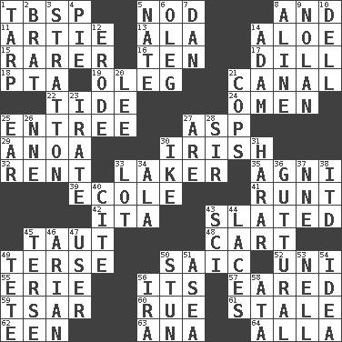 ACROSS 1. Cook's measure (abbr.) 5. Dreamland 8. Added to 11. Nick name for Arthur 13. Chicken ___ king 14. Medicinal plant 15. More uncommon 16. "___ Little Indians" 17. Deli pickle 18. Parent Teacher Association (abbr.) 19. Cassini of fashion 21. Lessep's creation 22. Periodic rise and fall of the sea level 24. Sign of something about to happen 25. Main course 27. Cleo's killer 29. Small Philippine buffalo 30. From or relating to Ireland 32. Monthly bill 33. Member of a famous L.A. basketball team 35. Hindu god of fire 39. Learning spot: Fr. 41. Undersized animal 42. Call ___ day 43. Scheduled 45. Strained 48. Draw slowly or heavily 49. Laconic 50. Ketch in the Levant 52. Single; one (prefix) 55. One of the Great Lakes 56. It is 57. Having ears or earlike features 59. Russian ruler of old 60. Regret 61. Lacking originality or spontaneity 62. Car or cant ending 63. Santa ___, CA 64. Silent film actress Nazimova DOWN 1. Canvas cover 2. Naughty child 3. Ski resort town in Vermont 4. Sliced dessert 5. Nathan's nickname 6. Cassini of fashion 7. One of the 12 tribes of Israel 8. Place in a line 9. Pitcher Ryan 10. Small valley 12. Wear away 14. First man 20. Area sheltered from the wind 21. 911 reaches them 23. Feeling or showing extreme anger 25. Ewer handle 26. Compass dir. 27. "We ___ not amused" (Victoria) 28. Title for a knight 30. D.D.E's nickname 31. Ethiopian city, capital of Harari 33. Car dealer's back yard 34. Insect wing 36. From the throat 37. Compass dir. 38. It would 40. Quote 43. _-fi 44. Shoestrings 45. Laconic 46. Believer in; advocate of (suffix) 47. One who makes use of a thing 49. Wig 50. Make senseless or dizzy 51. Toward the sea 53. 1994 drama film starring Jodie Foster 54. The content of cognition 56. Lyricist Gershwin 58. "One Day ___ Time"