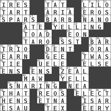 ACROSS 1. Angers 5. Make lace 8. _ and Stitch 12. Small pie 13. Operatic vocal solo 15. Greek god of love 16. Practice fights 18. Sharp remark 19. Billionth: prefix 20. Had dinner 22. Crying or shouting loudly 24. Frog relative 26. Age 27. Edible starchy tuberous root 28. Fast jet (abbr.) 29. Tavern 32. Musical group of three 35. Incision 37. Mouth or opening 38. Merit 39. Unit of force equal to gravity 40. It was, poetically 41. Standoff 42. Ubangi River tributary 43. Otherwise 44. Followers of ems 45. Followers of ems 46. Ardor 49. Opening into something insatiable 50. Shout 51. Catching in a trap 55. Teachers' org. 56. Not this but _ 57. Vintage cars 59. Choose 63. Coop moms 64. Inactive volcano in Sicily 65. Astrian river, tributary to the Danube 66. Son of Isaac 67. John Ritter's dad 68. Suggestive of the supernatural DOWN 1. ___ a Wonderful Life 2. Strike 3. Period 4. Ski resort town in Vermont 5. Keyboard key 6. Like ___ of sunshine 7. Become fatigued 8. Soviet premier 1918-24 9. SW Asia republic 10. Yearn 11. Bear (Spanish) 14. Most capable 17. Portico 21. Ewer handle 23. Car dealer's back yard 25. Evades 28. Dwarf with a sinus problem 29. Soup holder 30. Ancient river in northeast Turkey 31. Raze (variant) 32. Wig 33. Precipitation 34. Angers 36. Snakelike fish 40. Copy Pinocchio 42. Undo the wiring of 45. Ewer handle 47. Car or cant ending 48. Toward shelter 49. Taiwanese island in East China Sea 51. "______ My Girl" (Turtles hit) 52. Nanny 53. Remaining after all deductions 54. Went 56. Definite Article 58. Saxophone 60. Compass dir. 61. Auto 62. Attempt