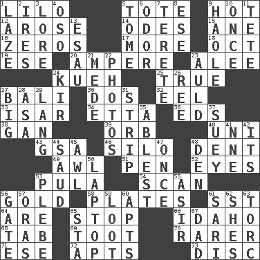 ACROSS 1. _ and Stitch 5. Carry 9. Being at a high temperature 12. Came up 14. Lyric poems 15. One (Scot) 16. Nothings 17. Greater amount 18. Sep. follower 19. Compass dir. 20. Electrical Unit 23. Toward shelter 24. Malaysian steamed pastry 25. Loyal 27. Indonesian resort city 30. Two (Sp.) 32. Snakelike fish 33. Astrian river, tributary to the Danube 34. Singer James 36. Begley and Asner 38. Separate the seeds from cotton 39. Globe 40. University (slang) 43. Girls' org. (abbr.) 46. Grain storage tower 48. Scratch 49. Leather borer 51. Fenced enclosure 52. Sight organs 53. Monetary unit of Botswana 54. Examine minutely or intensely 56. Gilt 58. Food holders 61. Fast jet (abbr.) 64. "We ___ not amused" (Victoria) 65. Constrict 66. Potato state 68. Bar bill 69. A blast of a horn 70. More valued for its uncommonness 71. Compass dir. 72. Flats, for short 73. Compact _ DOWN 1. Goldbrick 2. Angers 3. Old wives' tales, e.g. 4. Bear (Spanish) 5. Heavy book 6. Aroma 7. Cigar-shaped 8. Compass dir. 9. White Person, in Hawaii 10. At one time in the past 11. False hair 13. He sold his birthright 21. Ancient Persian 22. Pictures 23. Old (Scot.) 24. Apertif with cassis 26. Portuguese money of account (variant) 27. Massive 28. White ___ sheet 29. Austrian-born American filmmaker Fritz 31. Remove all contents or possession from 35. Most capable 37. Chop _ 41. Compass dir. 42. ___ a Wonderful Life 44. Saudi Arabian king (1953-1964) 45. Leather borer 47. At one time in the past 48. Lair 50. Portable computer 53. First-year military academy student 55. SW Saudi Arabia district 56. Yard entry 57. Mouths or openings 59. Plunder 60. Flats, for short 61. Indian skirt 62. "______ My Girl" (Turtles hit) 63. Torque (variant) 65. R.R. building 67. June honoree