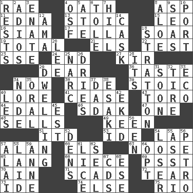 ACROSS 1. Actress Charlotte 4. Pledge 8. Viper 11. Pulitzer Prize-winning author Ferber 13. Unemotional 15. Lion 16. Thailand, formerly 17. Man or boy (slang) 18. Fly high 19. Add up to 21. Raised railways 22. Trial 23. Compass dir. 24. Conclusion 27. Apertif with cassis 29. Letter starter 30. Clothes sense 34. Immediately 36. Travel on or in a vehicle 39. Unemotional 40. Old wives' tales, e.g. 41. Desist 43. "Corrida" creature 44. Peak District village in England 46. Neighbor of Neb. 47. Single 48. Makes a sale 49. Peachy ____! 51. It would 53. Binary compound 54. Pet locale 57. ____ Jay Lerner 60. Raised railways 63. Trap for birds or small mammals 65. Long (Scottish) 66. Sibling's daughter 69. Inconspicuous attention getter 70. The 18th letter of the Arabic alphabet 71. Oodles 72. Rend 73. Binary compound 74. Otherwise 75. River (Sp.) DOWN 1. Musical pauses 2. Goodbye (Sp.) 3. Related on the mother's side 4. Order of Saint Francis (abbr.) 5. Had dinner 6. Lacquered or enameled metalware 7. Land elevation 8. Medicinal plant 9. Oceans 10. Sweet dark-red dessert wine 12. Housemaid (var.) 14. Keg 18. Ski resort town in Vermont 20. Area sheltered from the wind 25. Drug cop 26. Frees from moisture 28. It is 29. Home 31. Within a short period 32. Hoop that covers a wheel 33. Environmental prefix 34. Thickened enlargement 35. Relating to the mouth 37. Male parent 38. 1973 Nobel Price Winner (Physics) Leo 40. French article 42. Supplemented with great effort 45. Eastern Standard Time (abbr.) 50. Car or cant ending 52. Habitations of wild animals 54. Failure 55. Slender Brazilian palm 56. Stone: prefix 57. Mountain range southwest of Kyrgyzstan 58. Put down 59. Singer Murray 61. Louse (plural) 62. Lick closed 64. Elect 67. Music discs 68. Compass dir.