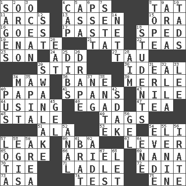 ACROSS 1. "Barney Miller" actor Jack 4. Balmoral and tarboosh 8. Make lace 11. Curves 13. NE Netherlands city 15. Mouth or opening 16. Moves 17. Thick mixture 18. Broke a traffic law 19. Related on the mother's side 21. Make lace 22. Afternoon social gatherings 23. Manchild 24. Say or write further 27. The 19th letter of the Greek alphabet 29. Tumult 30. Perfect 34. Opening into something insatiable 36. Object of repulsion 39. Haggard of country music 40. Dad 41. Connects, as a bridge 43. The longest river in the world 44. Putting into practice 46. Mild oath 47. Afternoon social gathering 48. Showing deterioration from age 49. Labels 51. In the manner of 53. Supplement with great effort 54. Connecticut Ivy Leaguer 57. Path through which fluid escapes 60. Basketball assoc. 63. Crowbar 65. Legendary monster 66. Satellite of Uranus 69. Grandmother 70. Make a knot 71. Dipping utensil 72. Prepare for publication 73. White ___ sheet 74. Trial 75. Compass dir. DOWN 1. Gurus 2. U. of Maine site 3. Sea 4. Head covering 5. White ___ sheet 6. Inconspicuous attention getter 7. Stalk of a moss capsule 8. Drink excessively 9. Type of rug 10. Small boys 12. Fast jet (abbr.) 14. Remaining after all deductions 18. SAT takers 20. Consume 25. Claim 26. Window treatment 28. Direct toward a target or goal 29. Tchaikovsky ballet 31. One of the Great Lakes 32. Silent film actress Nazimova 33. Area sheltered from the wind 34. Vertical spar for supporting sails 35. Capital of Western Samoa 37. Tired old horse 38. Maternal 40. Festering 42. Neighbor of Neb. 45. Set 50. Set 52. Of or related to the anus 54. Dodge 55. Soviet premier 1918-24 56. Feeling or showing extreme anger 57. Globular water bottle used in Asia 58. The front part of a cuirass 59. Type of rug 61. Naughty child 62. Helper 64. Compass dir. 67. Raised railways 68. Allow