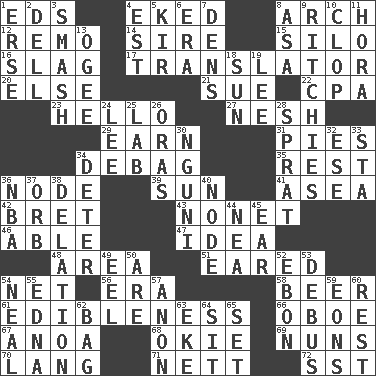 ACROSS 1. Begley and Asner 4. Made supply last 8. Bowlike part 12. San ____ (Riviera town) 14. Title for a man of rank and authority 15. Grain storage tower 16. Volcanic refuse 17. Interpreter 20. Otherwise 21. Institute legal proceedings 22. Accounting whiz (abbr.) 23. Phone greeting 27. Soft 29. Merit 31. Sliced desserts 34. Debunk (Brit. slang) 35. Remainder 36. Thickened enlargement 39. Player for Phoenix 41. At sea 42. Cy Young winner Saberhagen 43. Music written for nine 46. Competent 47. The main thing one is thinking about 48. Length times width 51. Having ears or earlike features 54. Fish or hair follower 56. Epoch 58. Fermented drink made from hops 61. The property of being fit to eat 66. Mitch Miller's instrument 67. Small Philippine buffalo 68. Migrant worker of the '30s 69. Religious women 70. Long (Scottish) 71. Remaining after all deductions 72. Fast jet (abbr.) DOWN 1. Celtic language 2. Small valley 3. Box-office sellout 4. Eastern Standard Time (abbr.) 5. Apertif with cassis 6. Period 7. Habitations of wild animals 8. White ___ sheet 9. Actors Guy, Robert Welles, and Clint 10. Hoof sound 11. Israeli folk dance 13. Double curve, resembling the letter S 18. Player for Phoenix 19. Area sheltered from the wind 24. Area sheltered from the wind 25. Experiment locale 26. Mouths or openings 28. Small fatty European fish 30. Group of southern Bantu languages 32. Compass dir. 33. R.R. building 34. Prevent from occurring 36. Basketball assoc. 37. Globe 38. Conveyance 40. Thickened enlargement 44. Teachers' org. 45. Ewer handle 49. Snakelike fish 50. "We ___ not amused" (Victoria) 52. Inky black, to poets 53. Alight from a bus 54. Anneal 55. Pulitzer Prize-winning author Ferber 57. Soon (poet.) 59. Immeasurably long periods of time 60. Repose 62. Paper or plastic container 63. Supplement with great effort 64. Be seated 65. Arrange properly for use