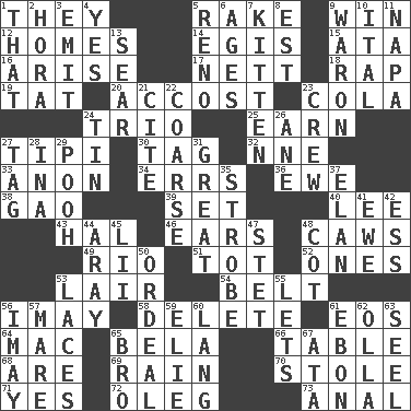 ACROSS 1. Those things 5. Immoral or dissolute person 9. Acquire through effort 12. Dwellings 14. Armor plate that protects the chest 15. _ moment's notice (2 wds.) 16. Ascend 17. Remaining after all deductions 18. Strike 19. Make lace 20. Buttonhole 23. Root beer relative 24. Musical group of three 25. Merit 27. Native american tent (variation) 30. Label 32. Compass dir. 33. Soon (poet.) 34. Blunders 36. She-sheep 38. E Mali city 39. Put into a specified state 40. Area sheltered from the wind 43. Actor Linden 46. Hearing organs 48. Crow sounds 49. _ de Janeiro 51. Small child 52. Singles 53. Den 54. Waist strap 56. "If ____ say so..." 58. Keyboard key 61. Greek goddess of the dawn 64. Apple computer (short form) 65. Actor Lugosi 66. Eating place 68. "We ___ not amused" (Victoria) 69. Water falling in drops from the sky 70. Fur scarf 71. Consenting reply 72. Cassini of fashion 73. Of or related to the anus DOWN 1. Not this but _ 2. Israeli folk dance 3. Give off 4. Affirmative reply 5. Western Nevada city 6. Grows older 7. Baby cat 8. Eastern Standard Time (abbr.) 9. Make _____ (do battle with) 10. Slanted text style (abbr.) 11. California wine valley 13. Singe 21. Quote 22. Rough 23. Ship's personnel 24. Metal container 26. One (Scot) 27. Label 28. _ tizzy (2 wds.) 29. "Silly old bear" 31. Relatively large 35. Disco prop 37. Enthusiasm 41. She-sheep 42. Double-curved letter 44. Like ___ of sunshine 45. Cards in a Roman deck? 47. Proofreading order 48. Small bed 50. Severe or trying experience 53. Shoestrings 55. Allows 56. "If ____ say so..." 57. Female horse 59. Writer Wiesel 60. Long (Scottish) 61. Inky black, to poets 62. Rounded earthenware pot or jar 63. Sew up the eyelids of hawks and falcons 65. Sis' sibling 67. "One Day ___ Time"
