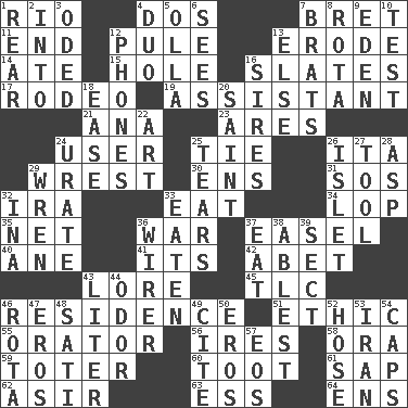 ACROSS 1. River (Sp.) 4. Two (Sp.) 7. Cy Young winner Saberhagen 11. Conclusion 12. Whine 13. Eat (away) 14. Had dinner 15. Hollow 16. Chalkboards 17. Cowboy competition 19. Aide 21. Santa ___, CA 23. Ancient Greek god of war 24. One who makes use of a thing 25. Standoff 26. Call ___ day 29. Obtain by seizing forcibly or violently 30. Followers of ems 31. Distress signal 32. Lyricist Gershwin 33. Consume 34. Trim (branches) 35. Fish or hair follower 36. Armed conflict 37. Artist's stand 40. One (Scot) 41. It is 42. Collude with 43. Old wives' tales, e.g. 45. Affectionate concern, for short 46. Dwelling 51. Principle of right and wrong 55. Speaker 56. Angers 58. Mouth or opening 59. Carrier 60. A blast of a horn 61. Plant excrement 62. SW Saudi Arabia district 63. Curvy letter 64. Followers of ems DOWN 1. Stern 2. To the inside or interior of 3. Wrote a lyric poem 4. Superhero pair 5. Rounded earthenware pot or jar 6. Perceives with the eye 7. Naughty children 8. Roll call or roster of names 9. Locale of original sin 10. Trial 12. Gives a jingle 13. Otherwise 16. Founders of families 18. Relaxation 20. Virtuous person 22. Tate display 24. A salt of uric acid 25. Rends 26. Small island 27. Implement 28. Viper 29. Songbird 32. _ tizzy (2 wds.) 33. Consumed 36. One who wires 37. Consume 38. Most capable 39. Religious group 43. 61 cubic inches 44. Aroma 46. Roll call or roster of names 47. Greek god of love 48. Suttee (variant) 49. Quote 50. Greek god of love 52. Stockings 53. SW Asia republic 54. Smile enhancers 57. Greek goddess of the dawn