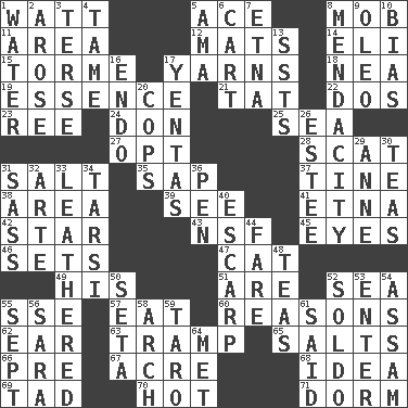 ACROSS 1. Electrical Unit 5. Adept person 8. Crowd into 11. Length times width 12. Floor coverings 14. Biblical high priest 15. Singer Mel 17. Tall tales 18. Teachers' org. 19. Gist 21. Make lace 22. Two (Sp.) 23. To separate or throw off 24. Spanish title 25. Ocean 27. Elect 28. Scram, to a cat 31. Table seasoning 35. Plant excrement 37. Prong on a fork 38. Length times width 39. Observe 41. Inactive volcano in Sicily 42. Play the lead 43. Overdraft (abbr.) 45. Sight organs 46. Puts into a specified state 47. Feline 49. Part of HMS, perhaps 51. "We ___ not amused" (Victoria) 52. Ocean 55. Compass dir. 57. Erode 60. Thinks logically 62. Ewer handle 63. _____ steamer (cargo ship) 65. Table seasonings 66. Before (prefix) 67. Land measure 68. It may be bright or harebrained 69. Small boy 70. Being at a high temperature 71. Dormintory (informal) DOWN 1. Wetness 2. Came up 3. Laconic 4. Docile 5. Nanny (var.) 6. Haul 7. Inactive volcano in Sicily 8. Ananias' fault 9. Butter sub 10. Prejudice 13. Fast planes 16. Inside; within (prefix) 17. Gossips 20. 911 reaches them 26. First name in cosmetics 29. Queen of England 1702-14 30. Beverages made from leaves 31. Backtalk 32. Johnson of "Laugh-In" 33. Resembling or made to resemble leather 34. Tarsus (plural) 36. Fenced enclosure 40. Fortification 44. Conductor's collection 48. Afternoon social gatherings 50. Bristle 52. Twentieth part of a lira 53. Keyboard key 54. Indian state 55. Back-to-school mo. 56. "Two Mules for Sister ____" 58. Bowlike part 59. Pacific island yam 61. Alleged 64. Was introduced to