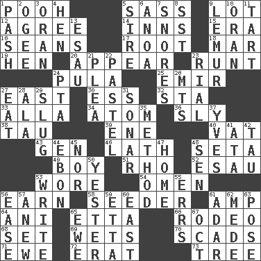 ACROSS 1. "Silly old bear" 5. Backtalk 9. Car dealer's back yard 12. Match 14. Taverns 15. Period 16. Actors Connery and Penn 17. Carrot, for example 18. Spoil 19. Layer 20. Become visible 23. Undersized animal 24. Monetary unit of Botswana 25. Arab leader 27. 90 degrees 30. Curvy letter 32. R.R. building 33. Silent film actress Nazimova 34. Tiny particle 36. Insidious 38. The 19th letter of the Greek alphabet 39. Compass dir. 40. Large container 43. Commissioned military rank (abbr.) 46. Thin strip of wood or metal 48. Bristle 49. Male child 51. 17th letter of the Greek alphabet 52. He sold his birthright 53. Had on 54. Sign of something about to happen 56. Merit 58. Sowing specialist 61. Electrical Unit 64. Cuckoo 65. Singer James 66. Cowboy competition 68. Arrange properly for use 69. Moistens 70. Tons 71. She-sheep 72. Part of Q.E.F. 73. Woody plant DOWN 1. Romantic infatuation 2. Double curve, resembling the letter S 3. Northwest Algerian city 4. Layer 5. Beget 6. Small Philippine buffalo 7. Sounds asleep 8. Fast jet (abbr.) 9. Arboreal primate 10. Northwest Algerian city 11. Small pie 13. Son of Isaac 21. Entreaty 22. Soft color 23. Monetary unit of Yemen 24. Parent Teacher Association (abbr.) 26. Mountains (abbr.) 27. Consume 28. In the manner of 29. A hard, heavy blow 31. Underwater navigation system 35. Mode 37. Jacques Cousteau's middle name 41. "One Day ___ Time" 42. The 19th letter of the Greek alphabet 44. Inky black, to poets 45. Or not 47. Residence 48. Elected rep. 50. Next before 53. Compose 55. Blunders 56. Comfort 57. Afresh 59. Singer James 60. 90 degrees 61. The sixth month of the Jewish calendar 62. Ancient Persian 63. Introduce or present, as a question 65. She-sheep 67. Sep. follower