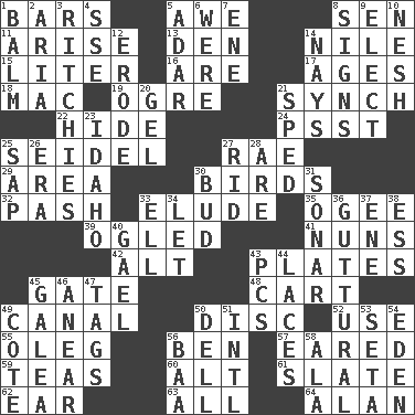 ACROSS 1. Soap units 5. Deep reverence 8. Elected rep. 11. Get up 13. Lair 14. The longest river in the world 15. 61 cubic inches 16. "We ___ not amused" (Victoria) 17. Eras 18. Big _ 19. Legendary monster 21. Synchronize (abbr.) 22. Flintstone garb 24. Inconspicuous attention getter 25. A glass for beer 27. Actress Charlotte 29. Length times width 30. Avian creatures 32. Romantic infatuation 33. Dodge 35. Double curve, resembling the letter S 39. Stared 41. Religious women 42. The first octave above the treble staff 43. Food holders 45. Yard entry 48. Draw slowly or heavily 49. Lessep's creation 50. Flat circle 52. Purpose 55. Cassini of fashion 56. Benjamin's nick name 57. Having ears or earlike features 59. Afternoon social gatherings 60. Keyboard modifier key 61. Schedule 62. Hearing organ 63. Everything 64. ____ Jay Lerner DOWN 1. Lip ointment 2. Roberta Peters solo 3. Actors Guy, Robert Welles, and Clint 4. Compass dir. 5. The sixth month of the Jewish calendar 6. We are 7. Compass dir. 8. Signals 9. Opt 10. Soft 12. Eat (away) 14. Negative votes 20. Set 21. Broke a traffic law 23. Potato state 25. Plant excrement 26. Epoch 27. To free from 28. "We ___ not amused" (Victoria) 30. Partially opened flower 31. Echolocation 33. Pipe bend 34. Allow 36. From the throat 37. Compass dir. 38. Double-curved letter 40. Highlander 43. Personal Computers (abbr.) 44. Shoestrings 45. An organ shaped like a helmet 46. Approach 47. Labels 49. ____ d'Azur (French Riviera) 50. Small valley 51. International (abbr.) 53. Bristle 54. Locale of original sin 56. Sound made by sheep 58. Wing