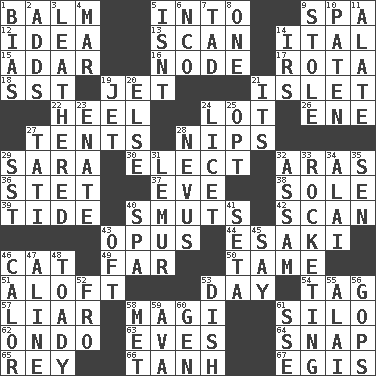 ACROSS 1. Lip ointment 5. To the inside or interior of 9. Health resort 12. It may be bright or harebrained 13. Glance over 14. Slanted text style (abbr.) 15. The sixth month of the Jewish calendar 16. Thickened enlargement 17. Round or rotation of duties 18. Fast jet (abbr.) 19. _ stream 21. Small island 22. Person who is morally reprehensible 24. Car dealer's back yard 26. Compass dir. 27. Portable shelters 28. Cuts off 29. "Two Mules for Sister ____" 30. Opt 32. Ancient river in northeast Turkey 36. Proofreading order 37. First lady 38. Flatfish 39. Event that recurs at intervals 40. Obscenities 42. Glance over 43. Musical composition 44. 1973 Nobel Price Winner (Physics) Leo 46. Domesticated feline 49. Distant 50. Docile 51. Upward 53. 24 hours 54. Label 57. One who doesn't tell the truth 58. Wise men 61. Grain storage tower 62. Southwest Nigerian state 63. Nights before holidays 64. Fastener 65. Marina Del _, California 66. Hyperbolic tangent 67. The front part of a cuirass DOWN 1. Prejudice 2. Sums up 3. Tough but pliablecoriaceous 4. Third mo. 5. Is not 6. Non-commissioned officer (abbr.) 7. Small boy 8. Single 9. Took without asking 10. Eucharist need 11. Having winglike extensions 14. Big collection agency 19. _ stream 20. Otherwise 21. ___ a Wonderful Life 23. Related on the mother's side 24. It is permitted: Lat. 25. Choose 27. Jacques of French films 28. Mole, birthmark 29. Fast jet (abbr.) 31. Arboreal primate 32. Indian state 33. Shooting up abruptly 34. Jai ____ 35. Elected rep. 40. Health resort 41. Stalk of a moss capsule 43. Often (poetically) 45. Declare 46. Bodily heat indicating an inflammation 47. Place in a line 48. Sycophant 52. Back 53. Food container 55. Jai _ 56. Republicans 58. Was introduced to 59. Actress Gardner 60. Commissioned mil. rank 61. Compass dir.