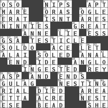 ACROSS 1. Bear (Spanish) 4. Cuts off 8. Fitting 11. Female horse 13. Mouths or openings 14. Stare at amorously 15. Part of Q.E.F. 16. Is not 17. Ancient Greek god of war 18. Simpletons 21. Relatively large 22. Queen of England 1702-14 23. Whopper 25. Double-curved letter 26. Girls' org. (abbr.) 29. One of the two male reproductive glands 32. Twentieth part of a lira 34. Adept person 35. Allow 38. Jai ____ 39. Having a sole or soles 41. Of or related to the anus 43. Conclusion 44. Binary compound 45. White American of non-Hispanic descent 46. Consumed 50. Marina Del _, California 51. Cleo's killer 54. Also 55. Conclusions 57. Russian prison camp 59. Snuggling 63. Monetary unit of Yemen 64. Passed on 67. Type of rug 68. Singer James 69. 43,560 square feet 70. A home for chicks 71. Compass dir. 72. Necklace unit 73. A female animal or person DOWN 1. Sign of something about to happen 2. Indian skirt 3. NW Algerian seaport 4. Annoying sounds 5. Big collection agency 6. Baking dish 7. Fast jet (abbr.) 8. Match 9. Entreaties 10. Trials 12. Inactive volcano in Sicily 14. Boat paddle 19. To the inside or interior of 20. Compass dir. 21. Set 23. Louse (plural) 24. On the rocks 26. Girls' org. (abbr.) 27. Not divided or shared with others 28. Actor Alda or Thicke 30. Falsehoods 31. Flair 33. "You Light Up My Life" star Conn 36. Engineer (abbr.) 37. Story 39. Signal 40. Wrote a lyric poem 42. Myrna of the movies 45. Does sums 47. Tired old horse 48. Watched over 49. Compass dir. 51. Match 52. Sets of matching outer garments 53. Food holder 56. Comedian Laurel of Laurel & Hardy 58. According to 60. Angers 61. Soft 62. Yard entry 64. Small moist lump or mass 65. Frozen water 66. Epoch