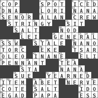 ACROSS 1. Police officer (slang) 4. Blemish 8. On the rocks 12. Heredity factor (abbr.) 13. Australian parrot (variant) 14. Grandmother 15. Sir (Sp.) 18. ____ Jay Lerner 19. Ship's personnel 20. Slender, wiry 22. Be seated 23. Table seasoning 24. Lower and raise head in agreement 25. Luau accessory 26. Commissioned military rank 30. Compass dir. 33. Having lost freshness 36. Billionth: prefix 37. Torque (variant) 39. Make supply last 40. Russian ruler of old 41. Butter sub 42. Lacking in sense or substance 44. Connecticut Ivy Leaguer 45. Pre-World Series prize 47. Afternoon social gathering 50. R.R. building 51. Grandmother 53. Institute legal proceedings 54. Felt deep pity or tenderness 57. A distinct part 59. Collude with 61. Effrontery 63. ____ d'Azur (French Riviera) 64. Table seasoning 65. Wedding promise 66. Mild oath 67. Dad 68. Curvy letter DOWN 1. Music discs 2. Singles 3. Leg coverings 4. Volcanic refuse 5. More than one (prefix) 6. Mouth or opening 7. Shallow baking pan 8. Event 9. Haul 10. Compass dir. 11. Fool 16. Spoken 17. Cause heat under the collar 21. Nuclear Threat Initiatives 22. Boy, to dad 24. Born 26. Small, secluded valley 27. To erase 28. Of or related to the anus 29. Australian parrot (variant) 30. Cease 31. Not divided or shared with others 32. Songbird 34. Portable shelter 35. Alias (abbr.) 38. Ingested 42. _ tizzy (2 wds.) 43. Inactive volcano in Sicily 46. Had dinner 48. Merit 49. Singer Murray 52. Nest on high 53. Stalk of a moss capsule 54. Sharp bark 55. Singer James 56. Movie discs 57. Frozen water 58. Coat; cloak 59. Viper 60. Sound made by sheep 62. Greek goddess of the dawn