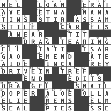 ACROSS 1. Cartoonist voice _ Blanc 4. Grant temporary use of 8. Part of Q.E.F. 12. "___ Maria" 13. Inactive volcano in Sicily 14. Nanny 15. Canisters 17. Agitate 18. Indian state 19. Vertical member of a panel or frame 21. 4-wheeled motor vehicle 23. Raised railways 24. Approach 26. Teat (slang) 28. To trail on the ground 30. Separating forcefully 34. Pipe bend 37. Jacques of French films 39. Astrian river, tributary to the Danube 40. E Mali city 41. Make improvements or corrections to 43. Had dinner 44. Helper 46. South American Indian 47. Marina Del _, California 48. Popular '50s hangout 51. Not kosher 54. Conclusion 55. Proofreads 58. Mouth or opening 61. Set 63. Slow-paced one 65. Drug addict 67. Medicinal plant 71. Rounded earthenware pot or jar 72. Writer Wiesel 73. Not women's 74. Shade tree 75. Lick closed 76. Sliced desserts 77. Compass dir. DOWN 1. Floor protectors 2. Webber/Rice musical 3. Soviet premier 1918-24 4. French article 5. Baseball player Mel 6. Cuckoo 7. Drug cop 8. Followers of ems 9. To erase 10. Of or related to the anus 11. Scottish caps 16. Downhill vehicle 18. Roberta Peters solo 20. Ewer handle 22. Had dinner 25. Assign a rank or rating to 27. Three (prefix) 29. Street urchin 30. Tinged 31. Astrian river, tributary to the Danube 32. Nathan's nickname 33. Jennifer or Joel 34. Mild oath 35. Den 36. Farming town in central California 38. "___ Little Indians" 42. Have the gumption 45. First lady 49. Engineer (abbr.) 50. Binary compound 52. Begley and Asner 53. A pale, very dry sherry 56. Stories 57. Beverly of Met fame 58. Lyric poems 59. Hero or heavy, e.g. 60. Capital of Western Samoa 62. Desk light 64. Unable to walk 66. Snakelike fish 68. Flowery wreath 69. Single 70. Double-curved letter