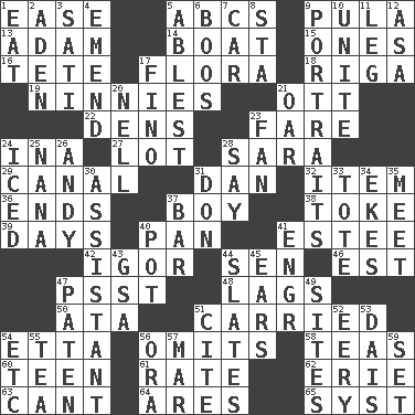 ACROSS 1. Comfort 5. Lettered men learn these first 9. Monetary unit of Botswana 13. First man 14. Water vessel 15. Singles 16. Wig 17. Plants 18. Capital of Latvia 19. Simpletons 21. Baseball player Mel 22. Habitations of wild animals 23. Conductor's collection 24. _ tizzy (2 wds.) 27. Car dealer's back yard 28. "Two Mules for Sister ____" 29. Lessep's creation 31. Daniel's nick name 32. A distinct part 36. Extremities 37. Male child 38. Puff or smoke 39. 24-hour periods 40. Baking dish 41. First name in cosmetics 42. Russian composer Stravinsky 44. Elected rep. 46. Eastern Standard Time (abbr.) 47. Inconspicuous attention getter 48. Fails to keep up a pace 50. _ moment's notice (2 wds.) 51. Borne 54. Singer James 56. Leaves out 58. Afternoon social gatherings 60. Adolescent 61. Assign a rank or rating to 62. One of the Great Lakes 63. Patter 64. Ancient Greek god of war 65. System (abbr.) DOWN 1. Consume 2. An important port of Yemen 3. Suttee (variant) 4. Make improvements or corrections to 5. Most capable 6. Scornful sounds 7. Automobile 8. R.R. building 9. Likenesses of persons 10. Join together 11. Part of a journey 12. White ___ sheet 17. A pale, very dry sherry 20. 1994 drama film starring Jodie Foster 21. Boat paddle 23. Avid follower 24. On the rocks 25. Grandmother 26. "60 Minutes" Commentator Rooney 28. Declare 30. Helper 31. Spanish title 33. Carryall 34. Makes supply last 35. Rendezvous 37. Drinking establishment 40. Cooking vessel 41. Engineer (abbr.) 43. Girls' org. (abbr.) 44. Chalkboards 45. Hearing organs 47. Eucharist need 49. Locates 51. Quote 52. Suggestive of the supernatural 53. Raised platform 54. And so on (abbr.) 55. Beverage made from leaves 56. Mouth or opening 57. Third mo. 59. Put into a specified state