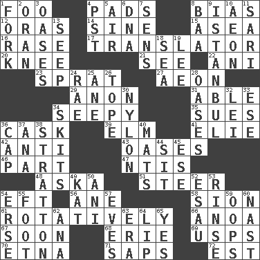 ACROSS 1. Egg _ yung 4. Writing tablets 8. Prejudice 12. Mouths or openings 14. Trig term 15. At sea 16. To erase 17. Interpreter 20. Leg joint 21. Observe 22. Black tropical American cuckoo 23. Small fatty European fish 27. Period of immesurable duration 29. At once, immediately (arch.) 31. Competent 34. Not well drained, as in land 35. Institutes legal proceedings 36. Keg 39. Shade tree 41. Writer Wiesel 42. Opposed to 43. Fertile tracts in a desert 46. Role in a play 47. Nuclear Threat Initiatives 48. "____ silly question..." 51. Bull 54. Lizard (obsolete) 56. A saturated hydrocarbon 58. The Jewish people; Israel 61. Producing rotation 66. Small Philippine buffalo 67. Within a short period 68. 4th largest of the Great Lakes 69. United States Postal Service (abbr.) 70. Inactive volcano in Sicily 71. Plant excrements 72. Eastern Standard Time (abbr.) DOWN 1. Tined utensil 2. NW Algerian seaport 3. Fertile tracts in a desert 4. Pacific Standard Time (abbr.) 5. Wind 6. Heredity factor (abbr.) 7. Elected reps. 8. Sound made by sheep 9. Byzantium, centuries later 10. Age 11. Indian skirt 13. Ooze 18. Ocean 19. Area sheltered from the wind 24. Actress Charlotte 25. One (Scot) 26. Drink excessively 28. Fertile tracts in a desert 30. Thermoplastic polyamide 32. Luau accessory 33. Compass dir. 34. Burlesque acts 36. Head covering 37. Santa ___, CA 38. Ski resort town in Vermont 40. Floor protectors 44. Be seated 45. Compass dir. 49. Krazy ___ of comics 50. Cuckoo 52. Son of Isaac 53. Remove soap 54. Celtic language 55. Pick up the tab 57. Nights before holidays 59. I made a mistake 60. Political cartoonist Thomas 62. Santa ___, CA 63. Period 64. Mouth edge 65. It is so