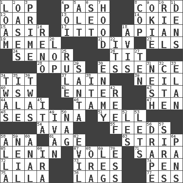 ACROSS 1. Trim (branches) 4. Romantic infatuation 8. Drawstring 12. Boat paddle 13. Margarine 14. Migrant worker of the '30s 15. SW Saudi Arabia district 17. "Tell ____ the Marines!" 18. Bee-related 19. Klaipeda city 21. HTML Container Element 23. Raised railways 24. Sir (Sp.) 26. Teat (slang) 28. Musical composition 30. Gist 34. Teat (slang) 37. (Had) reclined 39. Famous astronaut Armstrong 40. Compass dir. 41. Keyboard key 43. R.R. building 44. Jai _ 46. Not wild 47. Layer 48. French poetic form 51. Shout 54. Actress Gardner 55. Eats 58. Santa ___, CA 61. Mature 63. Remove all contents or possession from 65. Soviet premier 1918-24 67. Short-tailed, large-bodied rat 71. "Two Mules for Sister ____" 72. One who doesn't tell the truth 73. Angers 74. Writing instrument 75. Silent film actress Nazimova 76. Falls behind 77. Curvy letter DOWN 1. Rich soil 2. Fertile tracts in a desert 3. First class 4. Luau course 5. The first octave above the treble staff 6. Arrange properly for use 7. Parka part 8. Police officer (slang) 9. Migrant worker of the '30s 10. Monetary unit of Yemen 11. Cub Scout units 16. Former U.S. Attorney General Janet 18. Opinion 20. Chop off 22. It is 25. Court order 27. "___ Little Indians" 29. Before Barbara or Clara 30. Foe 31. Delicate 32. Quote 33. Liveliness 34. It was, poetically 35. Small island 36. It was, poetically 38. Call ___ day 42. Coral collection 45. Call ___ day 49. _ the terrible 50. Tired old horse 52. French article 53. Allows 56. Window treatment 57. Begets 58. Silent film actress Nazimova 59. Famous astronaut Armstrong 60. Of or related to the anus 62. Morally bad or wrong 64. Zero-star reviews 66. Retirement account (abbr.) 68. Mouth or opening 69. Part of a journey 70. Curvy letter