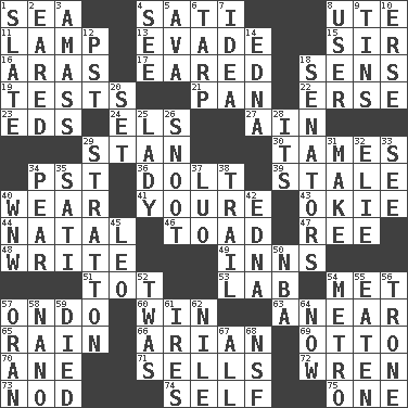 ACROSS 1. Ocean 4. Suttee (variant) 8. Shoshoni 11. Desk light 13. Elude 15. Title for a knight 16. Caspian sea tributary 17. Having ears or earlike features 18. Elected reps. 19. Trials 21. Baking dish 22. Celtic language 23. Begley and Asner 24. Raised railways 27. The 18th letter of the Arabic alphabet 29. Comedian Laurel of Laurel & Hardy 30. Makes less strong or intense 34. Pacific Standard Time (abbr.) 36. Stupid person 39. Having lost freshness 40. Put on (as clothing) 41. You are 43. Migrant worker of the '30s 44. Relating to or accompanying birth 46. Frog relative 47. To separate or throw off 48. Compose 49. Lodging establishments 51. Small child 53. Experiment locale 54. Was introduced to 57. Southwest Nigerian state 60. Victory 63. Approach 65. Precipitation 66. Believer in; advocate of (suffix) 69. Von Bismarck 70. A saturated hydrocarbon 71. Exchanges for money 72. Songbird 73. Allow head to fall sleepily 74. Automatically 75. Single DOWN 1. Chalkboard 2. Having ears or earlike features 3. Collect or gather 4. Perceive with the eye 5. Actress Gardner 6. Canvas cover 7. It may be bright or harebrained 8. One who makes use of a thing 9. Metal containers 10. Celtic language 12. Pacific Standard Time (abbr.) 14. Pulitzer Prize-winning author Ferber 18. Legislators 20. Put into a specified state 25. Kenny Rogers chart-topper in '80 26. Snob 28. ___ a Wonderful Life 29. Ski resort town in Vermont 31. Cause to be 32. Writer Wiesel 33. Perceive with the eye 34. Lightbulb-shaped fruit 35. Suttee (variant) 37. Nilotic language 38. Drop behind 40. Compass dir. 42. Pulitzer Prize-winning author Ferber 45. Lion 50. Basketball assoc. 52. It was, poetically 54. Paris' subway 55. Consumed 56. Heavy duty weighing machine 57. NW Algerian seaport 58. Billionth: prefix 59. Passed on 61. Angers 62. Mediterranean tributary 64. Immediately 67. 100% 68. Overdraft (abbr.)