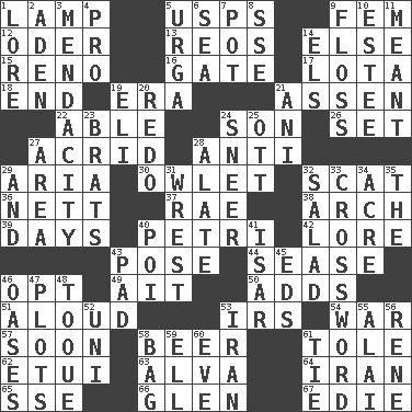 ACROSS 1. Desk light 5. United States Postal Service (abbr.) 9. Opposite of masc. 12. River in Europe 13. Vintage cars 14. Otherwise 15. Former U.S. Attorney General Janet 16. Yard entry 17. Globular water bottle used in Asia 18. Conclude 19. Epoch 21. NE Netherlands city 22. Competent 24. Boy, to dad 26. Put into a specified state 27. Bitter 28. Opposed to 29. Roberta Peters solo 30. A small or young owl 32. Scram, to a cat 36. Remaining after all deductions 37. Actress Charlotte 38. Bowlike part 39. 24-hour periods 40. _ dish (used to culture cells) 42. Old wives' tales, e.g. 43. Airs 44. Gospel singer Marvin 46. Elect 49. Small island 50. Does sums 51. Verbally 53. Big collection agency 54. Armed conflict 57. Within a short period 58. Fermented drink made from hops 61. Lacquered or enameled metalware 62. Needle case 63. Inventor's middle name 64. SW Asia republic 65. Compass dir. 66. Small, secluded valley 67. Singer Brickell DOWN 1. Old wives' tales, e.g. 2. Arabian gulf 3. Ananias' fault 4. Adept person 5. Capital and largest city of Mongolia 6. Ocean 7. Cooking vessel 8. Compass dir. 9. Soft thread for cleaning between teeth 10. First name in cosmetics 11. Intended 14. Raised railways 19. Biblical high priest 20. Make new 21. Black tropical American cuckoo 23. Naughty children 24. Scornful expression 25. Baseball player Mel 27. Type of rug 28. Having winglike extensions 29. Also 31. Obtain by seizing forcibly or violently 32. First course 33. What you're doing now 34. Land measure 35. Definite Article 40. Luau course 41. Astrian river, tributary to the Danube 43. Groovy apt. 45. Begley and Asner 46. Fertile tracts in a desert 47. Secret plans 48. Woman's close-fitting hat 52. University (slang) 53. SW Asia republic 55. Mountain range southwest of Kyrgyzstan 56. French philosopher Descartes 58. Container for groceries 59. Pipe bend 60. First lady 61. Standoff