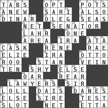 ACROSS 1. Bar bills 5. Choose 8. Plant holders 12. Afresh 13. Indian skirt 15. In addition 16. Middle Eastern gold or silver currency 18. Cassini of fashion 19. Oceans 20. Fish or hair follower 22. Elected representative 24. Cowardly lion portrayer 26. Single 27. Length times width 28. Retirement account (abbr.) 29. "One Day ___ Time" 32. Keg 35. French philosopher Descartes 37. Actress Charlotte 38. Writer Wiesel 39. Retirement account (abbr.) 40. "Beetle Bailey" pooch 41. Friend of Pooh 42. Comedian Laurel of Laurel & Hardy 43. Distinctive style or manner 44. "___ Little Indians" 45. Like a shrinking violet 46. Otherwise 49. Rowing implement 50. Bring up, as a child 51. Those who practice law 55. Title for a knight 56. Hang loosely or laxly 57. Raised platform 59. Natives or inhabitants of Denmark 63. Otherwise 64. Beget 65. Trial 66. Narrow, elongated depression 67. Fish or hair follower 68. Singer James DOWN 1. Small boy 2. Cuckoo 3. Benjamin's nick name 4. Tchaikovsky ballet 5. Bear (Spanish) 6. Friends 7. Family _ (genealogy) 8. Thick mixture 9. Margarine 10. Russian ruler of old 11. Mayday 14. Snub 17. Hitchcock's "____ Window" 21. Definite Article 23. Santa ___, CA 25. Noteworthy scarcity 28. More lacking in sense or substance 29. Johnson of "Laugh-In" 30. Jacques of French films 31. Period of immesurable duration 32. An absolute certainty 33. _ vera 34. The Jewish people; Israel 36. Period 40. Make much ado about nothing 42. Tears up 45. Declare 47. French article 48. Stated 49. A small or young owl 51. Hang loosely or laxly 52. In addition 53. Water falling in drops from the sky 54. Title for a man of rank and authority 56. French article 58. Put into a specified state 60. Fish or hair follower 61. Eastern Standard Time (abbr.) 62. R.R. building