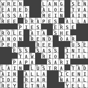 ACROSS 1. Songbird 5. Long (Scottish) 9. Elected rep. 12. Having ears or earlike features 14. Medicinal plant 15. Federal power corp. 16. Slender Brazilian palm 17. Count _ (2 wds.) 18. The 18th letter of the Arabic alphabet 19. To sift 20. Window treatments 23. Silent film actress Nazimova 24. Sliced desserts 25. Celtic language 27. Hero or heavy, e.g. 30. "One Day ___ Time" 32. A female animal or person 33. Soon (poet.) 34. Tear apart 36. Boat paddle 38. For each 39. Portuguese money of account (variant) 40. Purpose 43. Double-curved letter 46. Backtalk 48. International (abbr.) 49. The 23rd letter of the Hebrew alphabet 51. _ de Janeiro 52. Slanted text style (abbr.) 53. Dad 54. Indian skirt 56. (Had) reclined 58. A period of five years 61. Small boy 64. The 18th letter of the Arabic alphabet 65. Silent film actress Nazimova 66. Ancient Celtic tribe of eastern Britain 68. Binary compound 69. Located in or toward the back 70. Brizilian seaport 71. Marina Del _, California 72. Inactive volcano in Sicily 73. Shout DOWN 1. Erode 2. Raze (variant) 3. Celtic language 4. Teachers' org. 5. Desk light 6. Toward shelter 7. Annoying sounds 8. Commissioned mil. rank 9. Showing deterioration from age 10. Morally bad or wrong 11. Nanny 13. "You Light Up My Life" star Conn 21. Located in or toward the back 22. Michaelmas daisies 23. Toward the sea 24. Fenced enclosure 26. 17th letter of the Greek alphabet 27. Strike 28. Single 29. Old wives' tales, e.g. 31. Approach 35. Cease 37. The smallest animal of a litter 41. R.R. building 42. Pipe bend 44. Comedian Laurel of Laurel & Hardy 45. Plant excrement 47. Fly high 48. One more than two 50. Place for singles 53. Abounding in pines 55. Water falling in drops from the sky 56. Den 57. Assistant 59. ____ Bator, Mongolia 60. "Two Mules for Sister ____" 61. Wig 62. Of or related to the anus 63. Deli pickle 65. "We ___ not amused" (Victoria) 67. Island